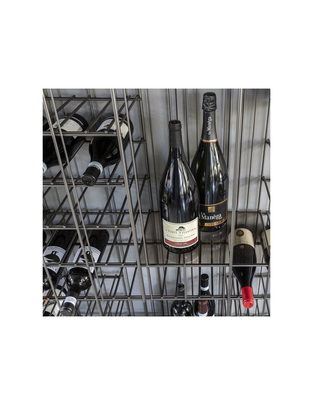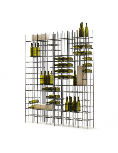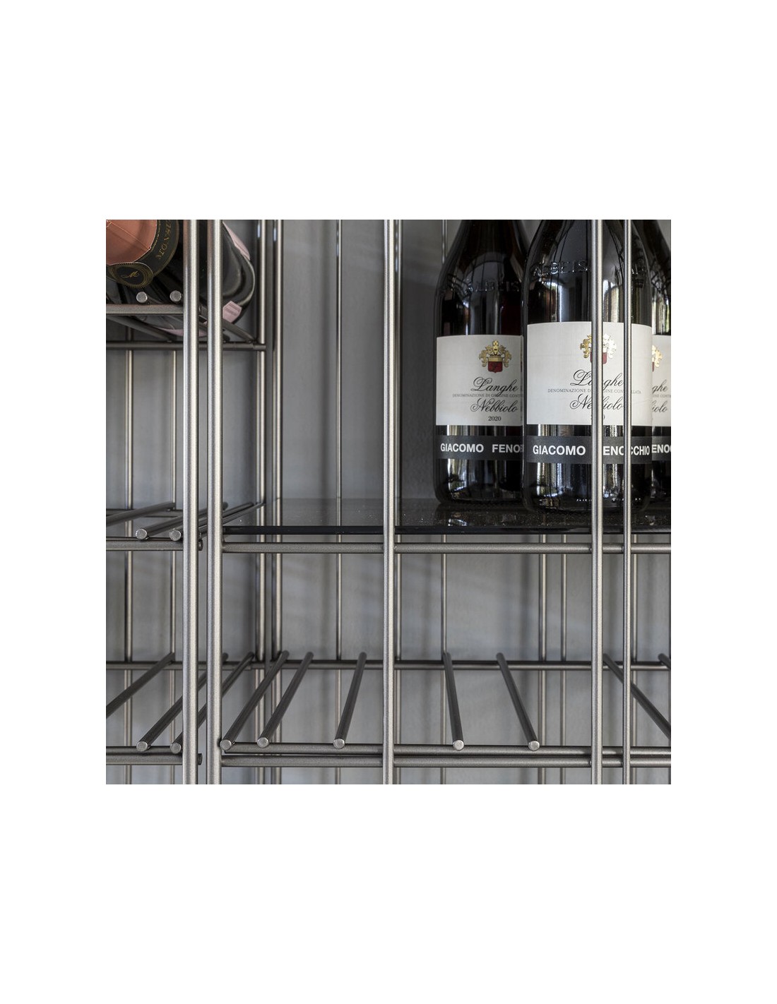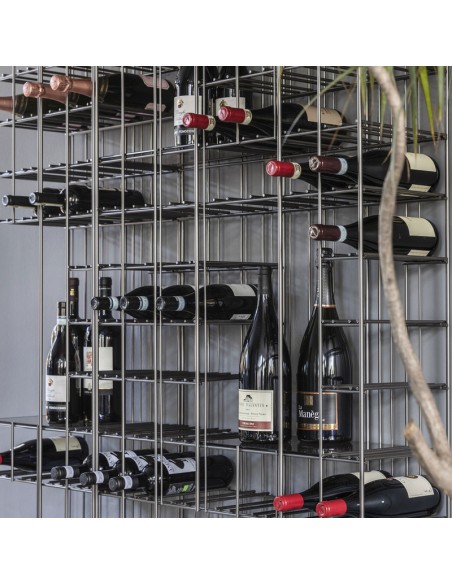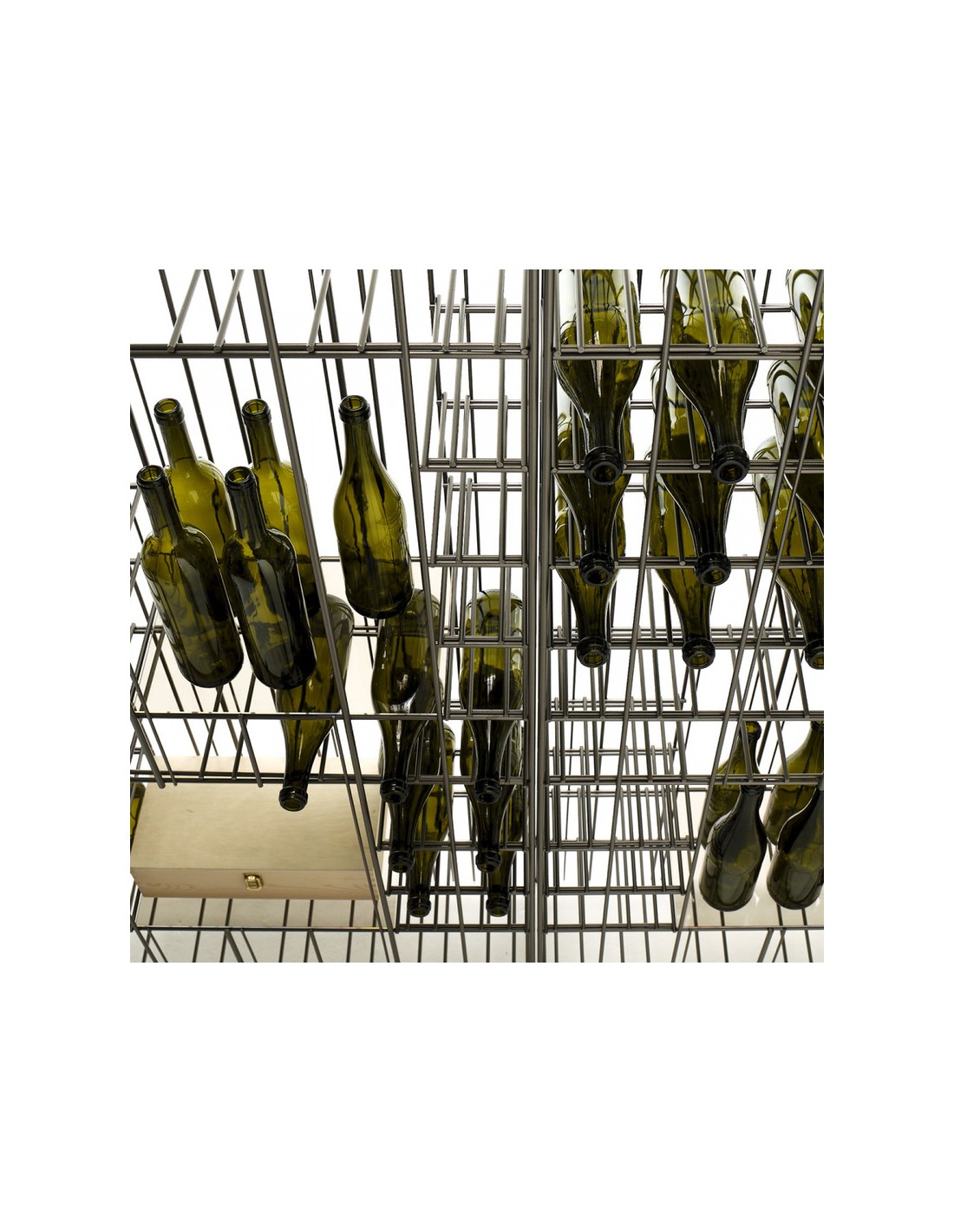 Metrica Wine è un portabottiglie caratterizzato da una semplice struttura in metallo brunito il cui ritmo è scandito dalle bacchette di ferro entro i quali, le bottiglie e gli oggetti, ne completano la forma scrivendo di volta in volta nuove composizioni. Il kit di 3 ripiani in vetro (che deve essere ordinato insieme al porta bottiglie), è disponibile in verde o bronzo. Richiede il fissaggio a parete e il kit ferramenta è incluso: 4 piedini regolabili, 2 ganci di fissaggio di sicurezza a parete, 2 giunti di unione e griglie porta.