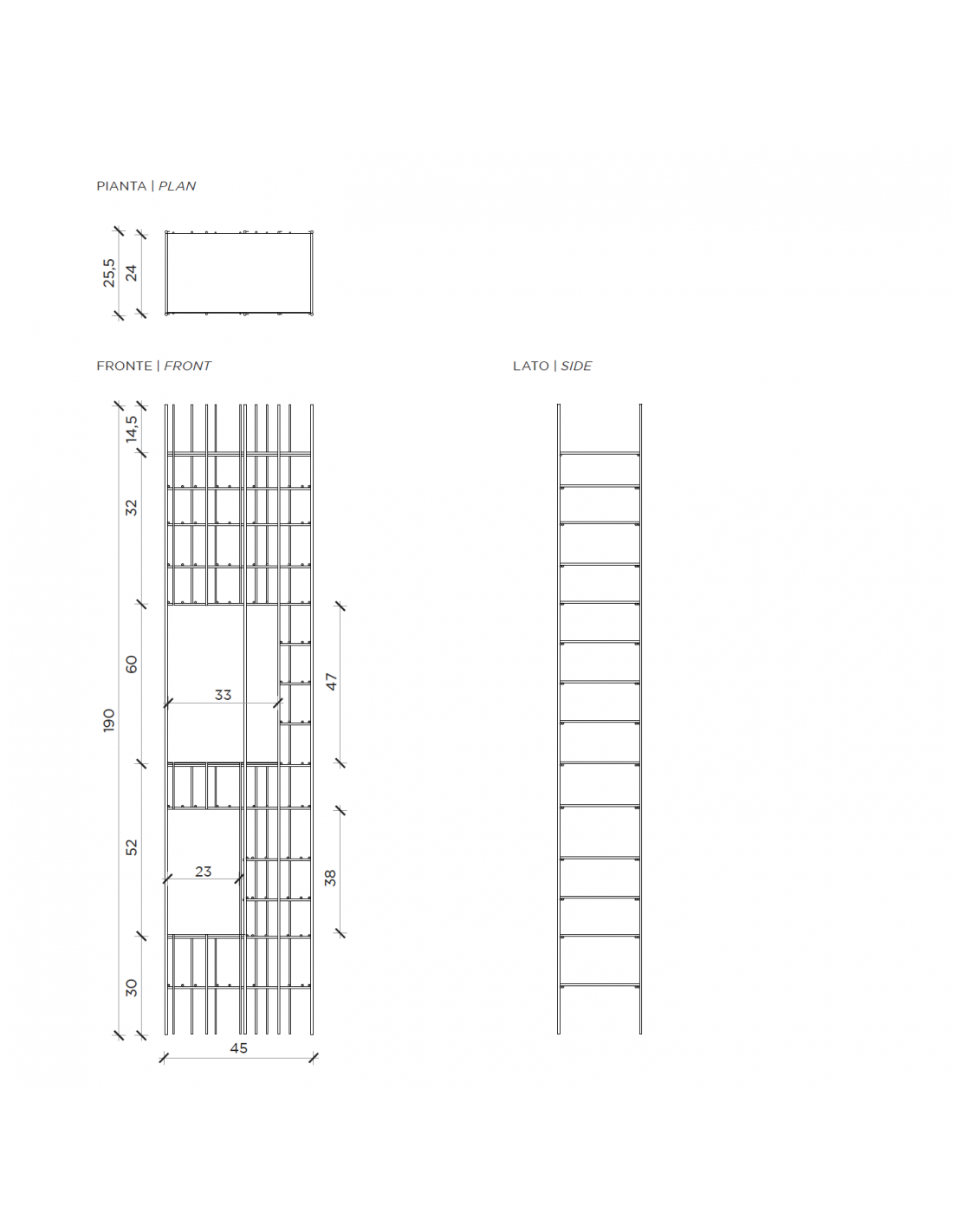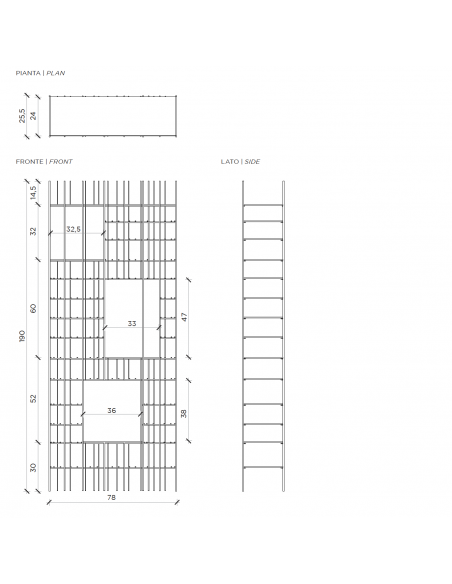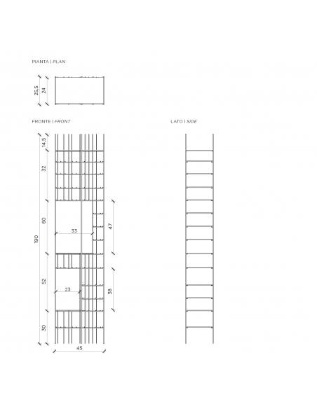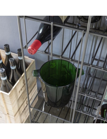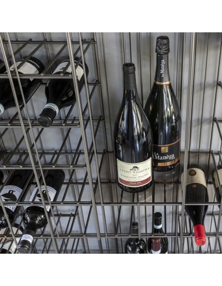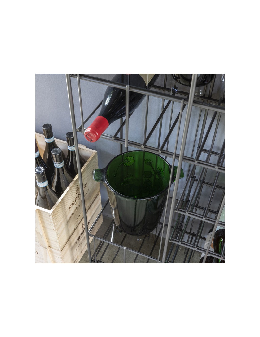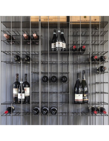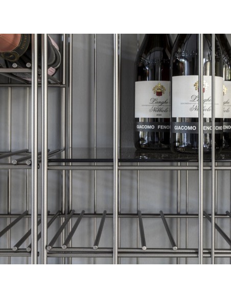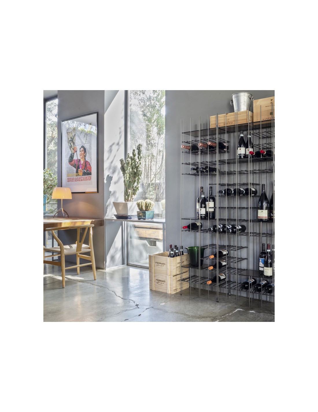Metrica Wine è un portabottiglie caratterizzato da una semplice struttura in metallo brunito il cui ritmo è scandito dalle bacchette di ferro entro i quali, le bottiglie e gli oggetti, ne completano la forma scrivendo di volta in volta nuove composizioni. Il kit di 3 ripiani in vetro (che deve essere ordinato insieme al porta bottiglie), è disponibile in verde o bronzo. Richiede il fissaggio a parete e il kit ferramenta è incluso: 4 piedini regolabili, 2 ganci di fissaggio di sicurezza a parete, 2 giunti di unione e griglie porta.