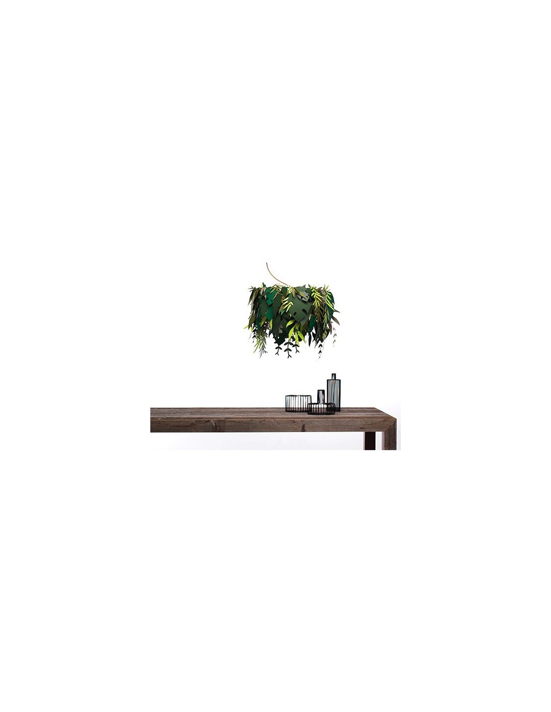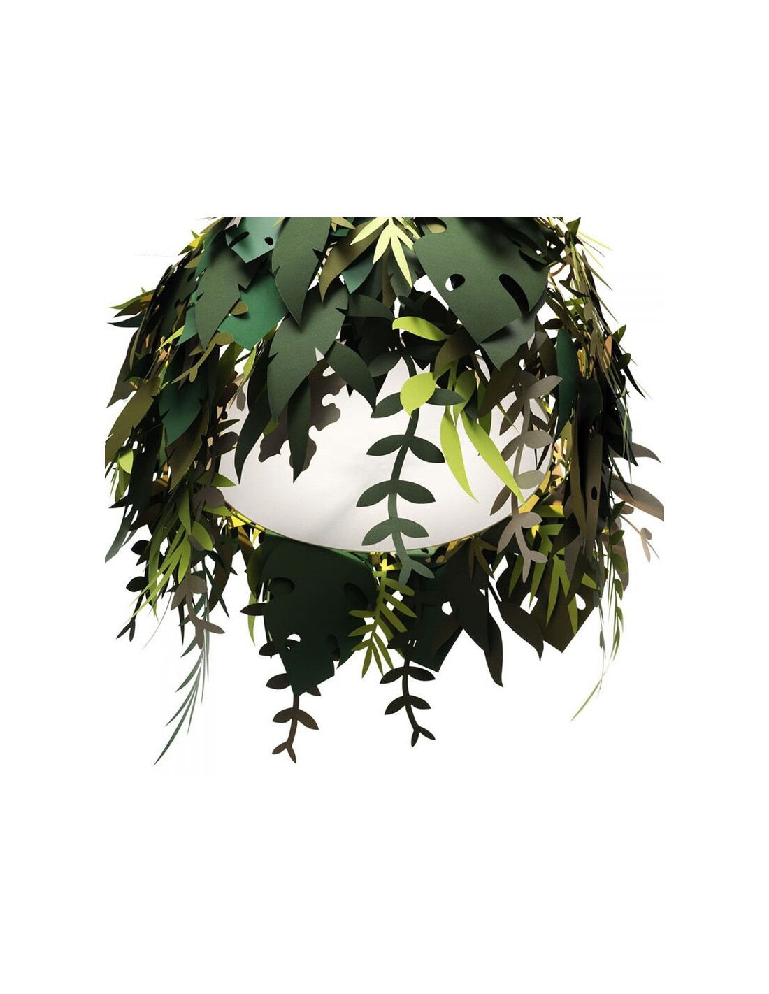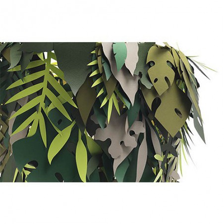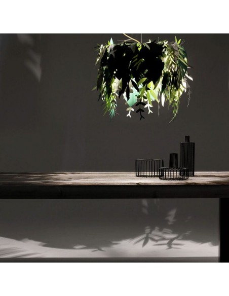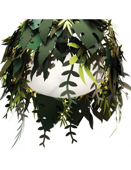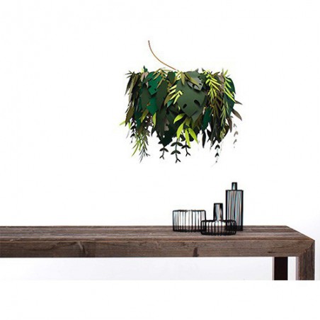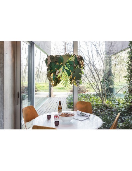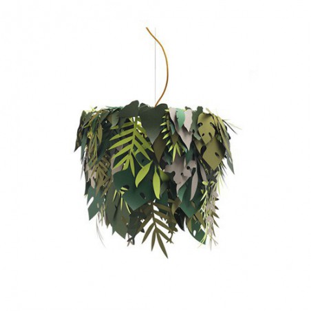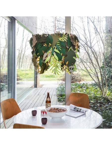 La lampada Amazzonio è una lampada a sospensione con cui il designer ha voluto trasferire la natura nel tuo ambiente domestico attraverso l'utilizzo di foglie realizzate in carta plastificata nelle diverse sfumature del verde.