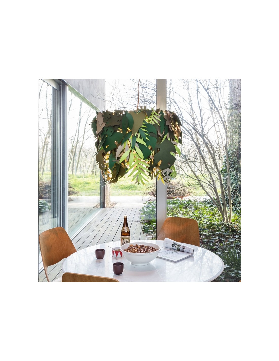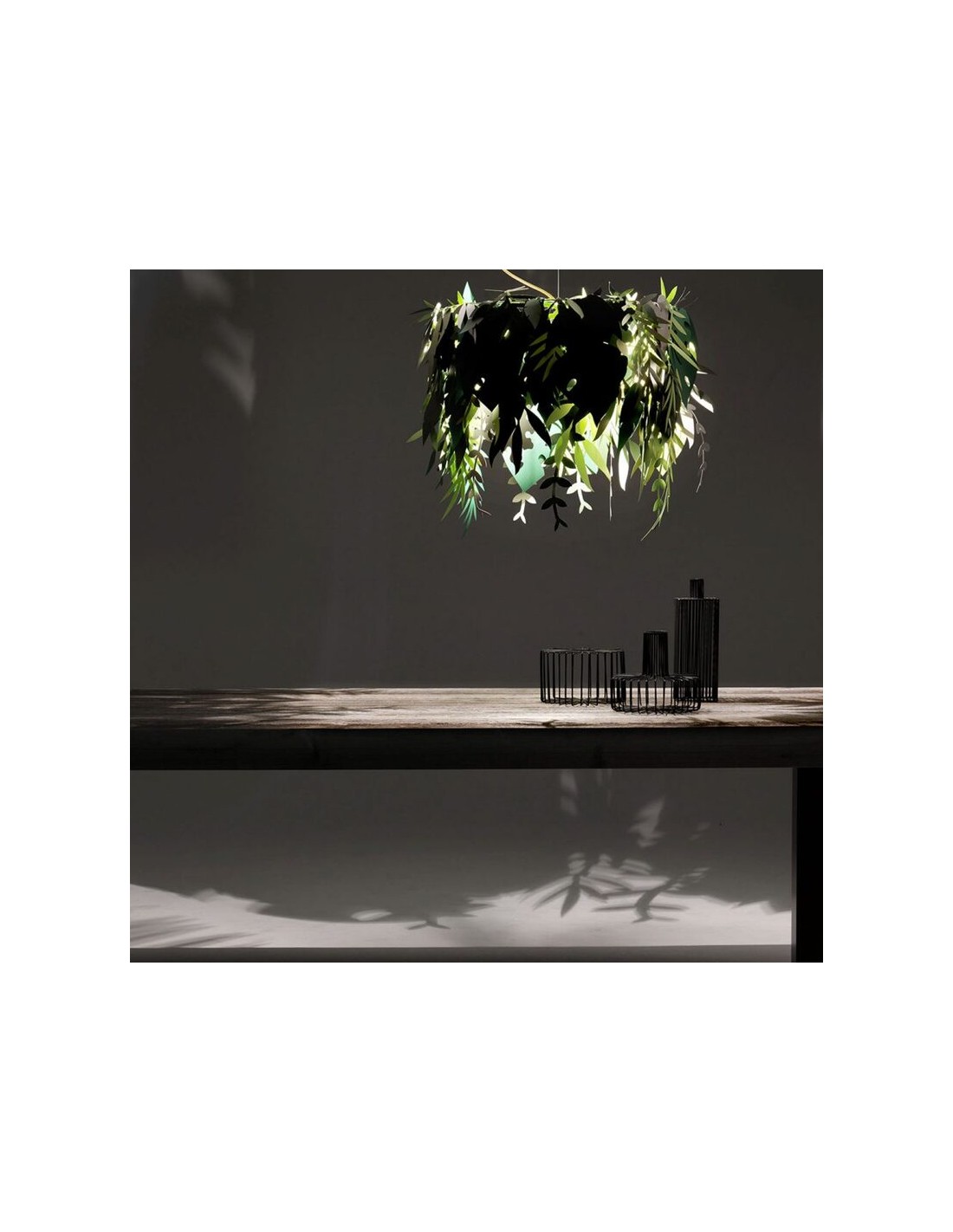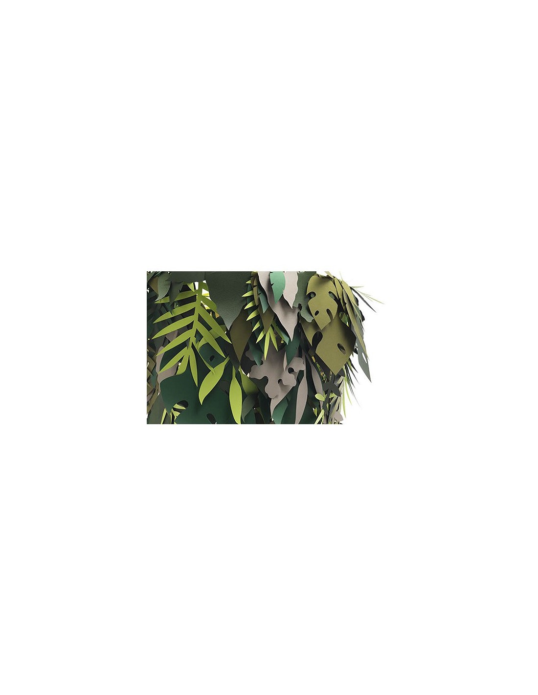 La lampada Amazzonio è una lampada a sospensione con cui il designer ha voluto trasferire la natura nel tuo ambiente domestico attraverso l'utilizzo di foglie realizzate in carta plastificata nelle diverse sfumature del verde.