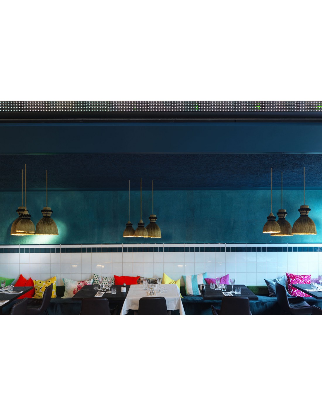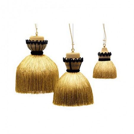La lampada Madama è stata ideata da Cristina Celestino per Mogg. Il design prende ispirazione da un abbigliamento specifico e in modo particolare da una sottogonna tipica del XIX secolo. Il volume imponente del paralume è dato da un elemento in acciaio e da rocchetti in legno. La lampada ha un richiamo allo stile orientale. Lampada a sospensione con paralume in metallo rivestito in frange di tessuto (lampadina con attacco E27|MAX60W, esclusa).