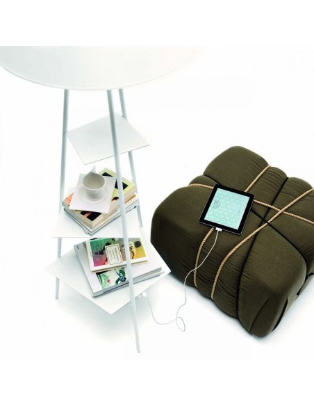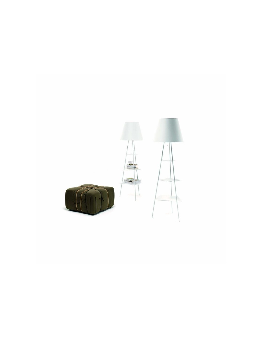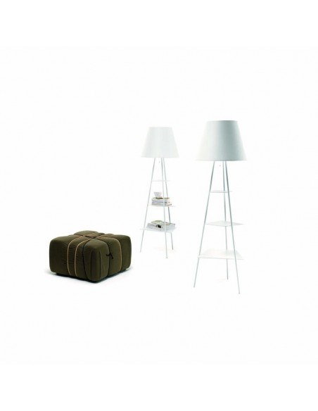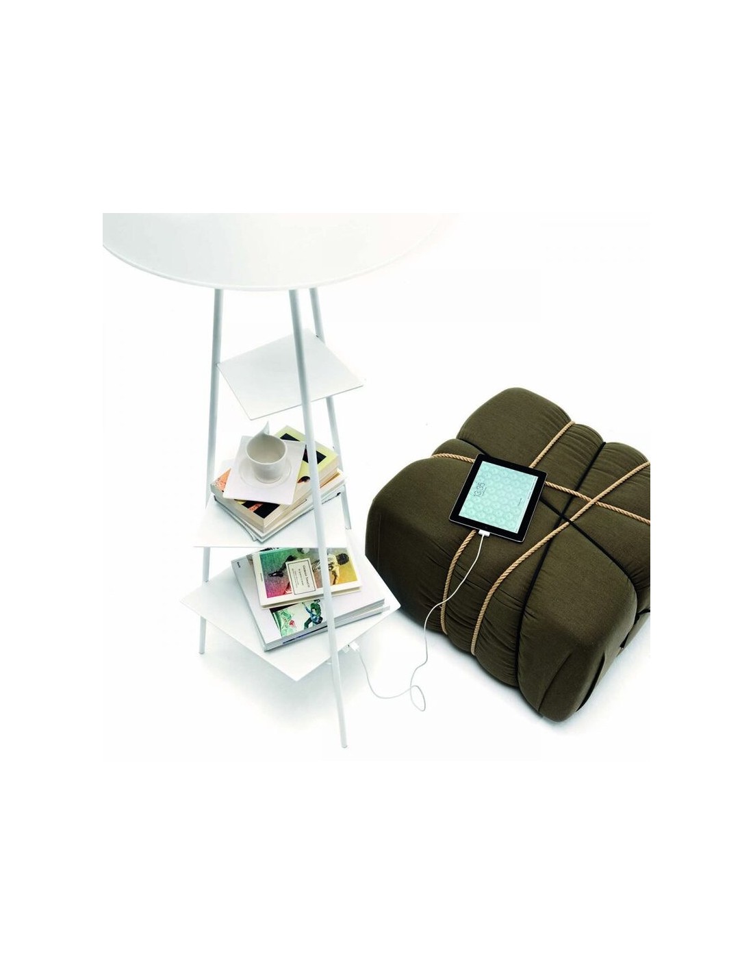 Mai nome fu più soddisfacente di questo, omaggio al distretto nella città di NEW YORK, Tribeca lo storico centro industriale ormai una delle zone più rinomate della grande mela. Tri.be.ca. è una lampada ètagère da terra in metallo verniciato opaco. Ha il paralume in tessuto di cotone accoppiato con pvc opalino. La lampada svolge tre funzioni, la classica ovvero illuminare, la seconda con un adattatore di carica USB carica tutto 12 v posizionata sotto il ripiano inferiore e il terzo come contenitore grazie aio suoi ripiani. Il cavo elettrico è rivestito in tessuto. La lampada è disponibile nei colori bianco e nero.