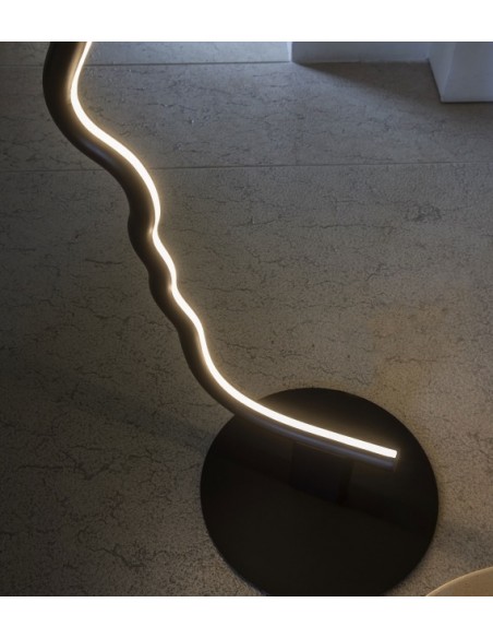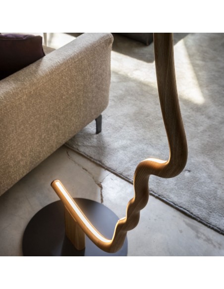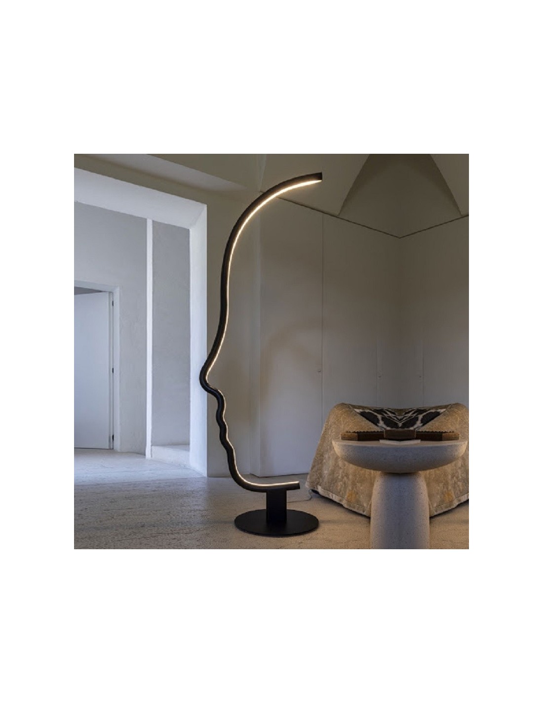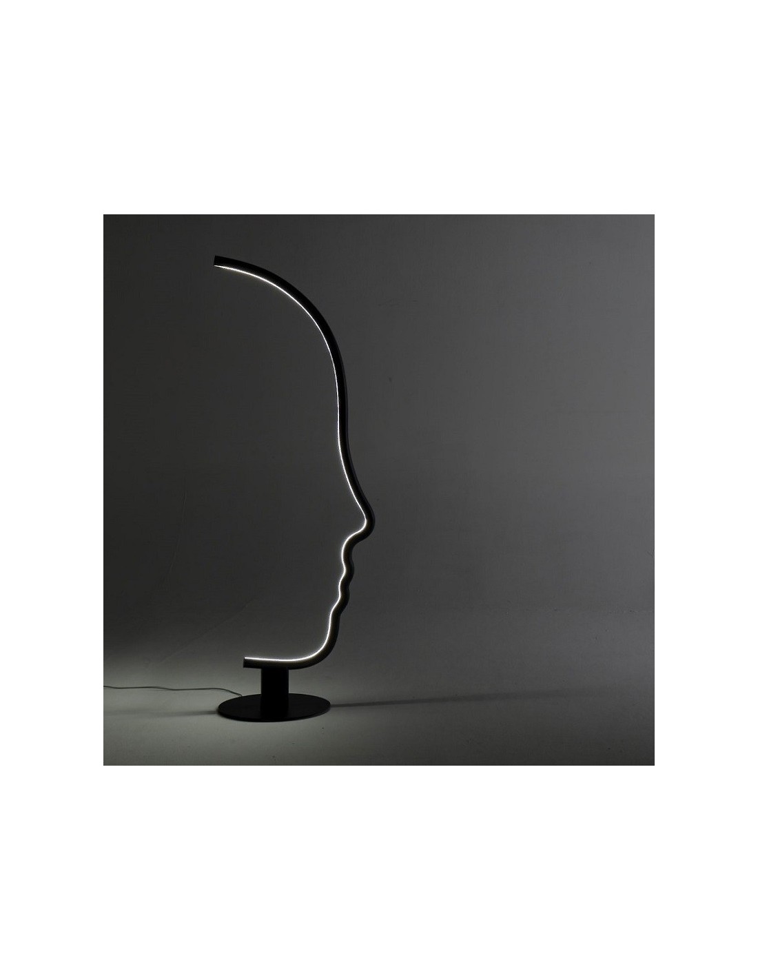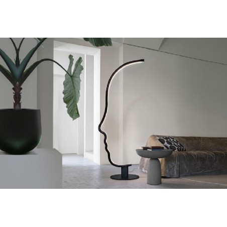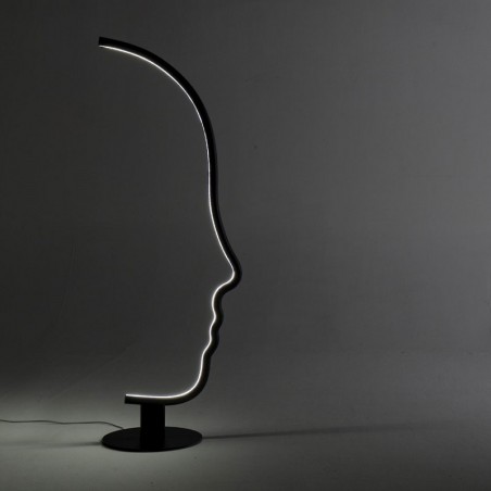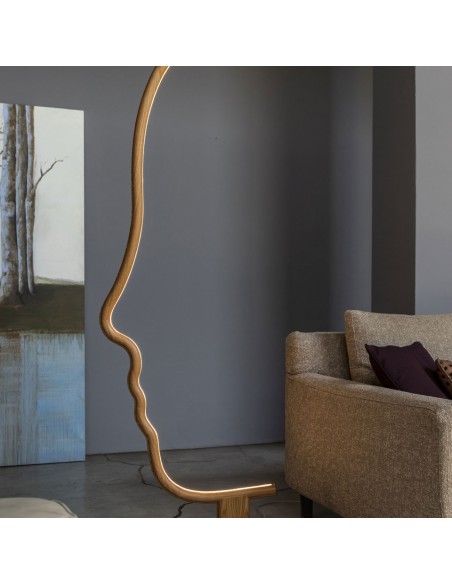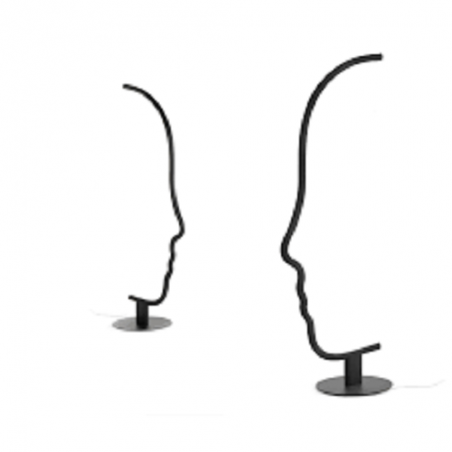 VIS A VIS è una lampada da terra dal forte segno grafico che vuole essere una micro-installazione domestica, pur mantenendo le qualità funzionali della lampada. All'interno della struttura a forma di viso, è istallata una striscia a led che illumina con stile il vostro ambiente. La struttura in legno è disponibile in legno laccato nero o castagno ed è sorretta da una base in metallo nero.