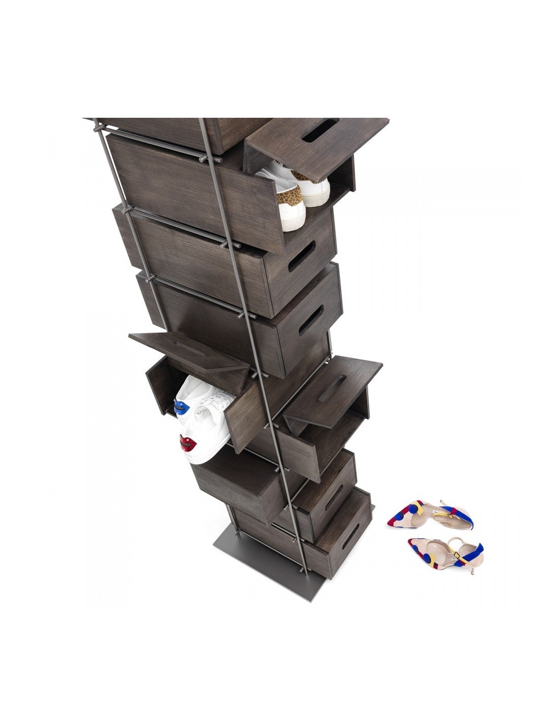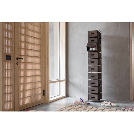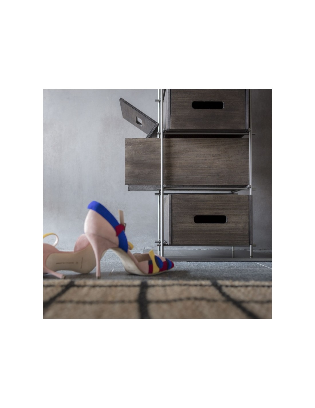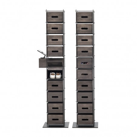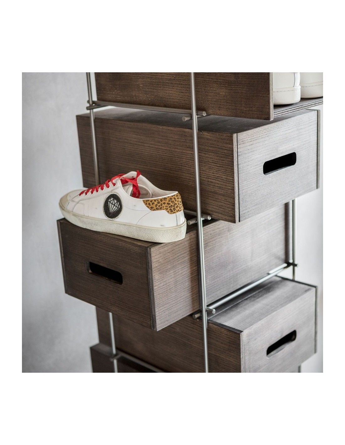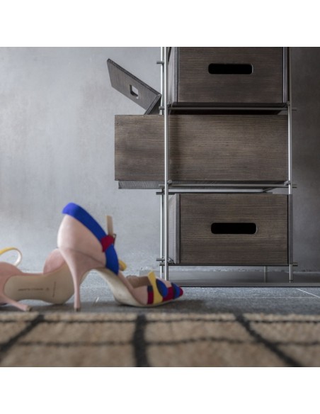 Manolo rivoluziona il concetto di scarpiera. Fiera e forte non va nascosta ma esibita con fierezza: la struttura in ferro e i cassetti in frassino massello colore moka, sono elementi di un concetto del tutto nuovo e funzionale che si mostra nella sua elegante compostezza. Manolo è una scarpiera che non si deve nascondere ma che vuole essere esibita nell’ambiente domestico.