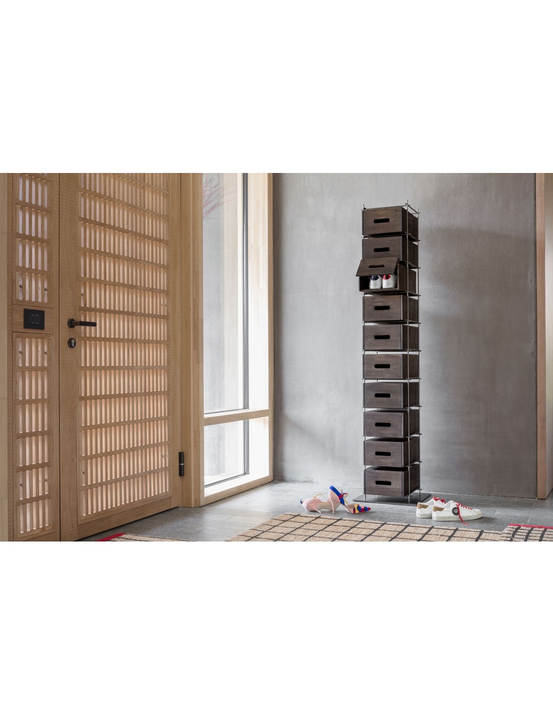 Manolo rivoluziona il concetto di scarpiera, un concetto del tutto nuovo e funzionale che si mostra nella sua elegante compostezza.