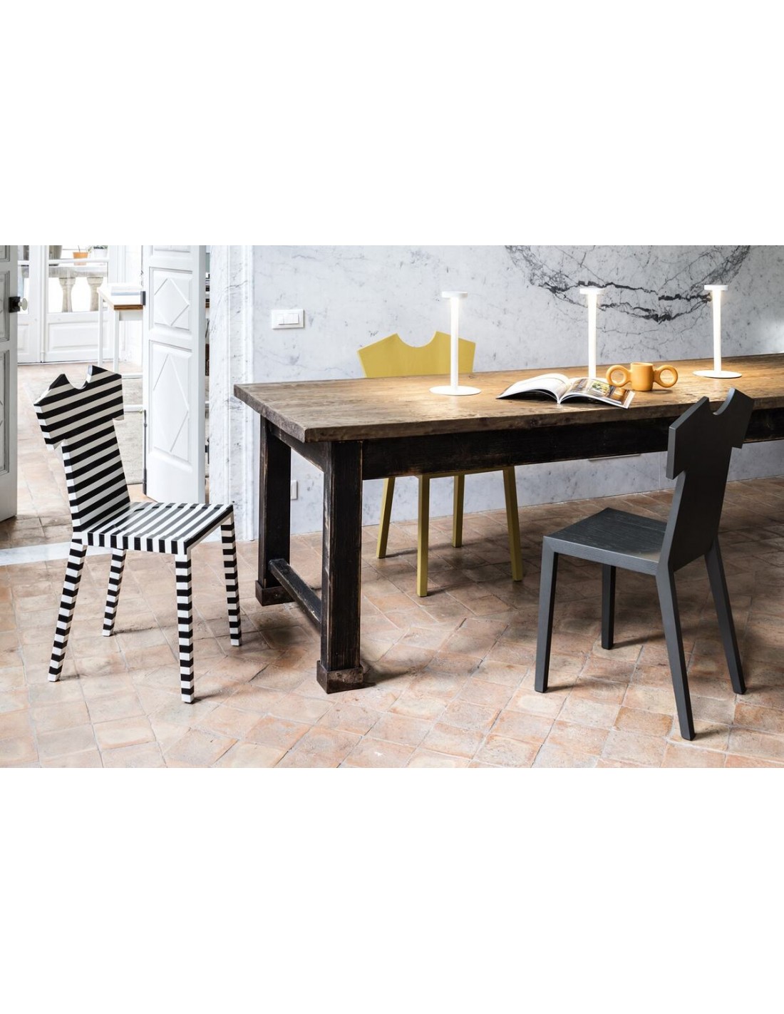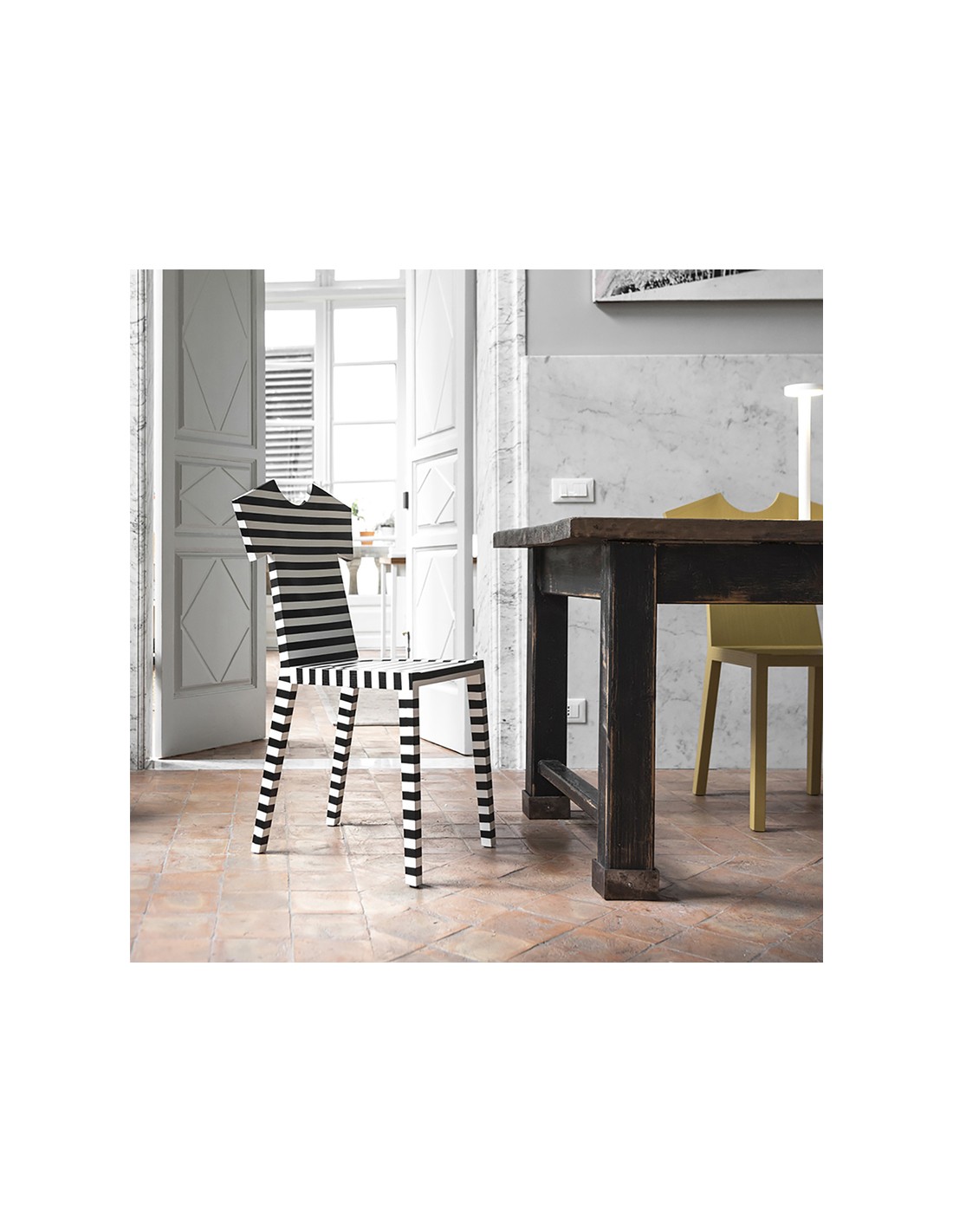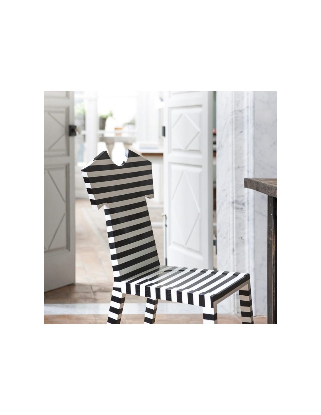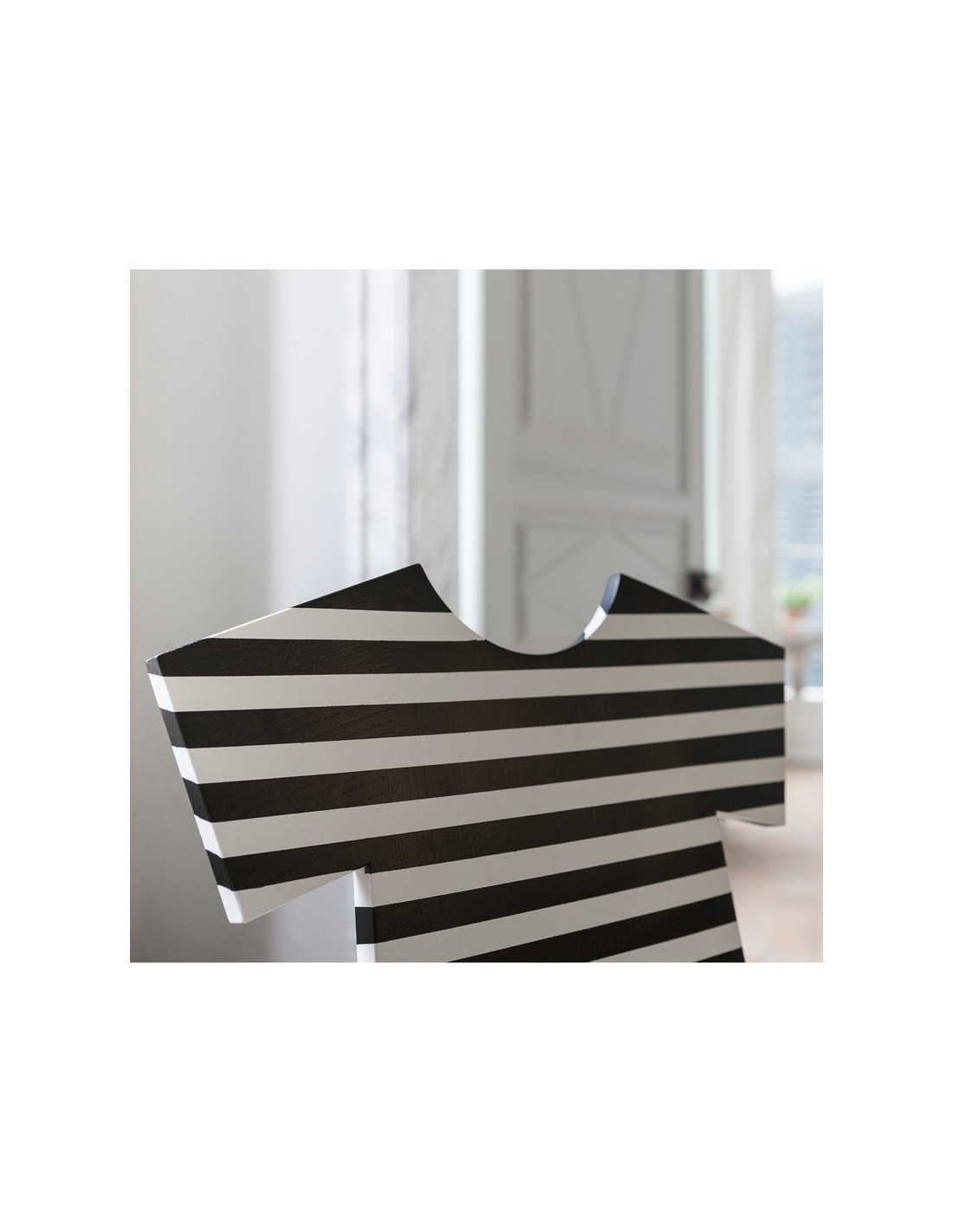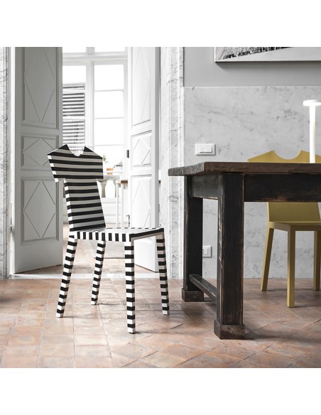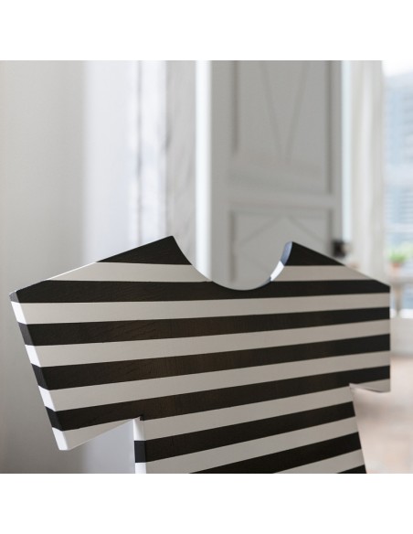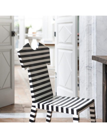 La nuova sedia T-CHAIR nasce dalla fantasia creativa della designer Annebet Philps per Mogg. T-Chair è una sedia con lo schienale dalla forma originale ispirata alla T-Shirt, da cui deriva anche il nome. È realizzata in massello di frassino tinta coprente opaco poro aperto, disponibile in monocolore (colori RAL) oppure decorata a mano a righe orizzontali con colori a scelta. Questa sedia offre un tocco giocoso e moderno a tutti gli ambienti della tua casa.