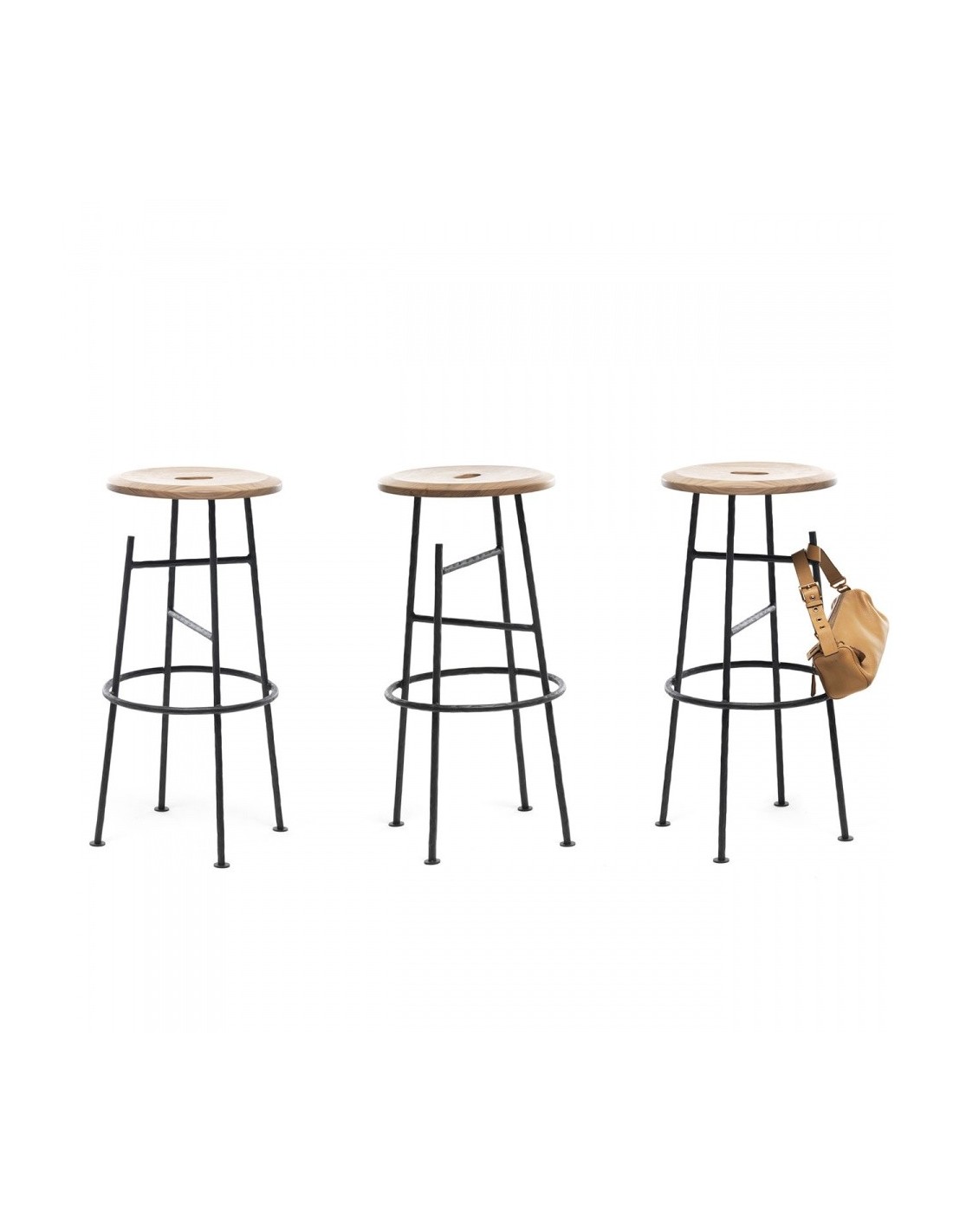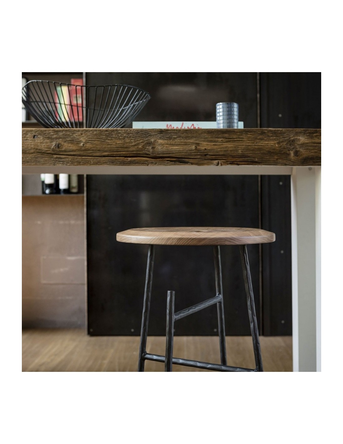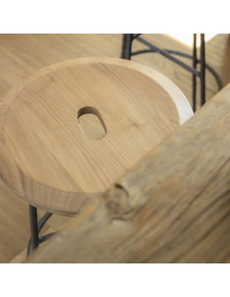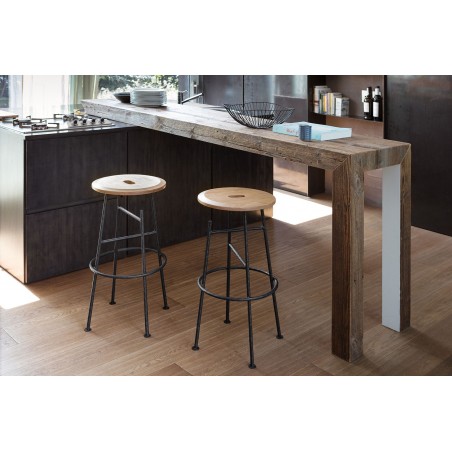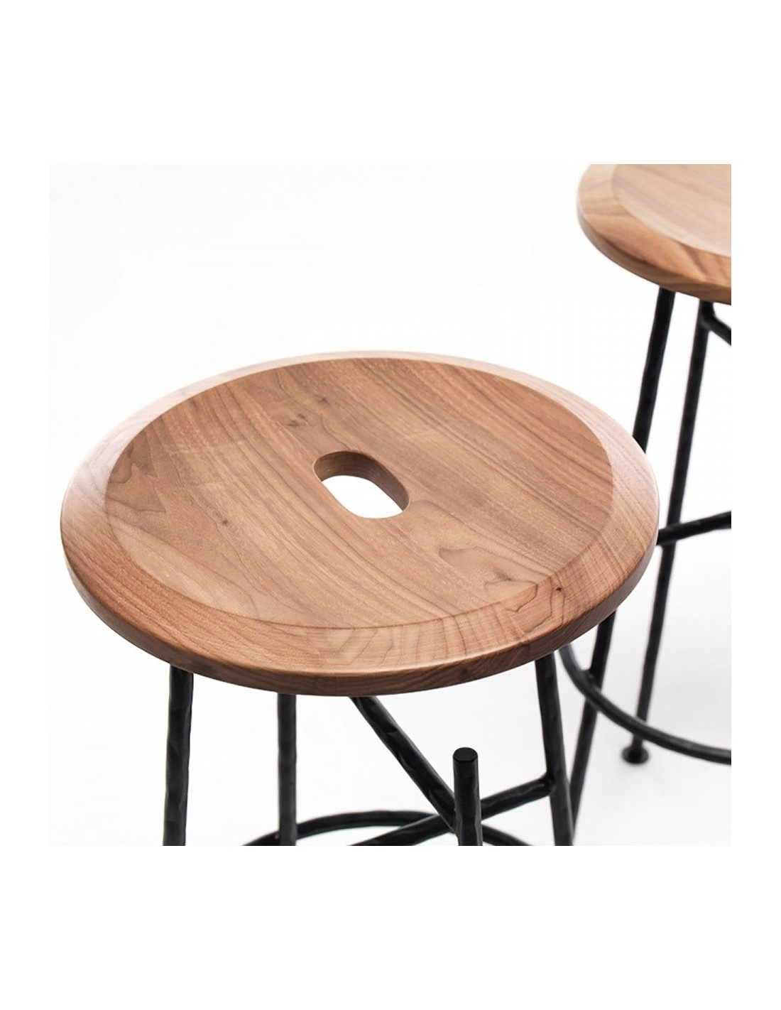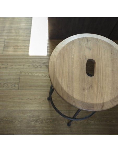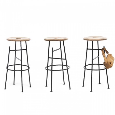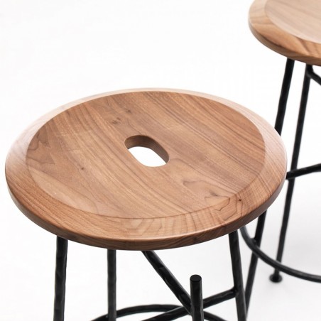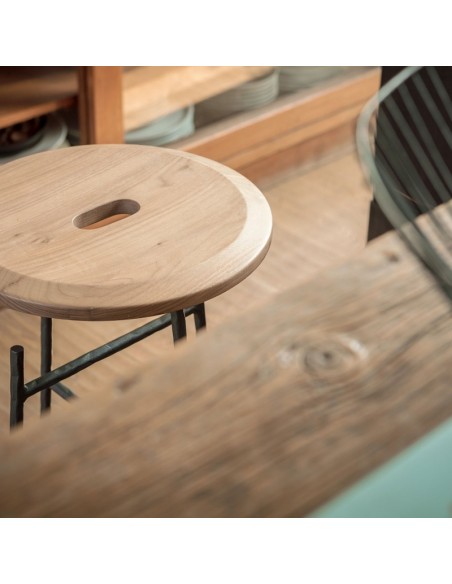 Sbagliato è lo sgabello social di Mogg con struttura in ferro battuto e seduta in massello di Noce Canaletto. Il taglio della gamba diventa un gancio per borse e abiti permettendoci di avere le mani libere e dedicarci a quello che stiamo facendo in completa libertà e di dialogare con i gesti, qualsiasi essi siano.