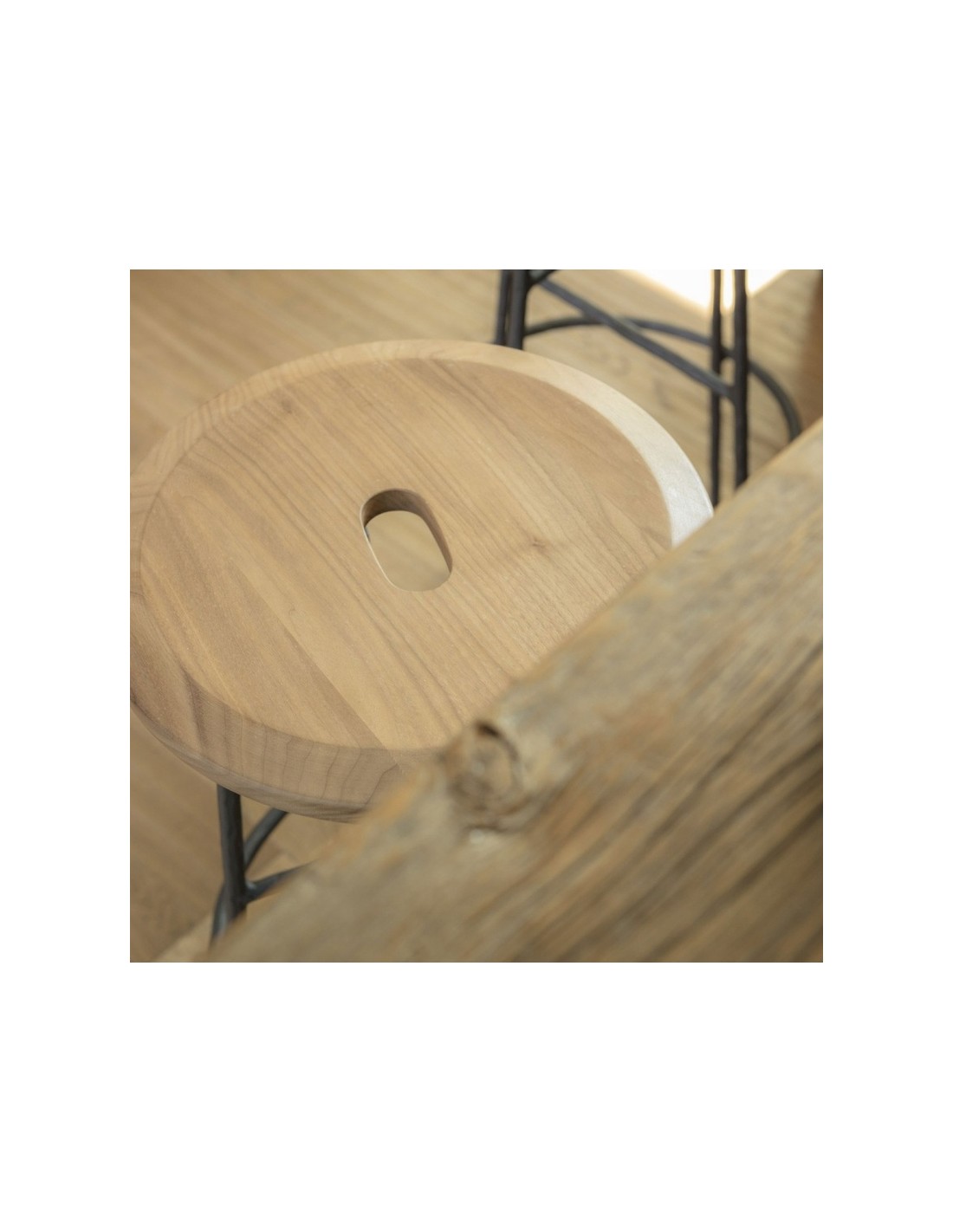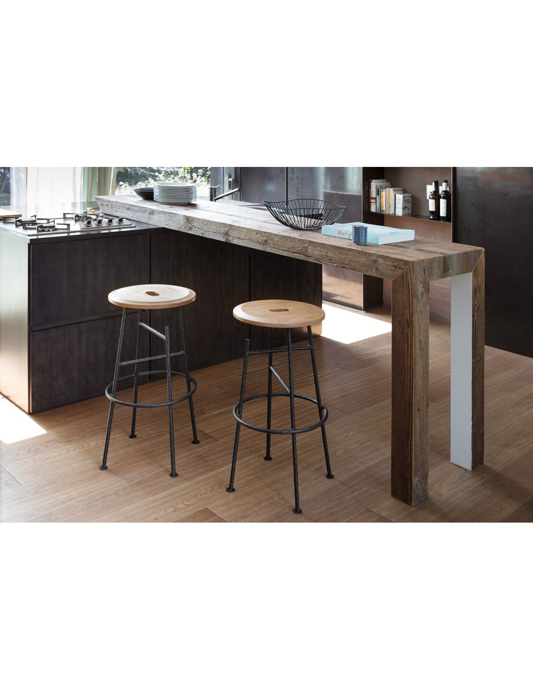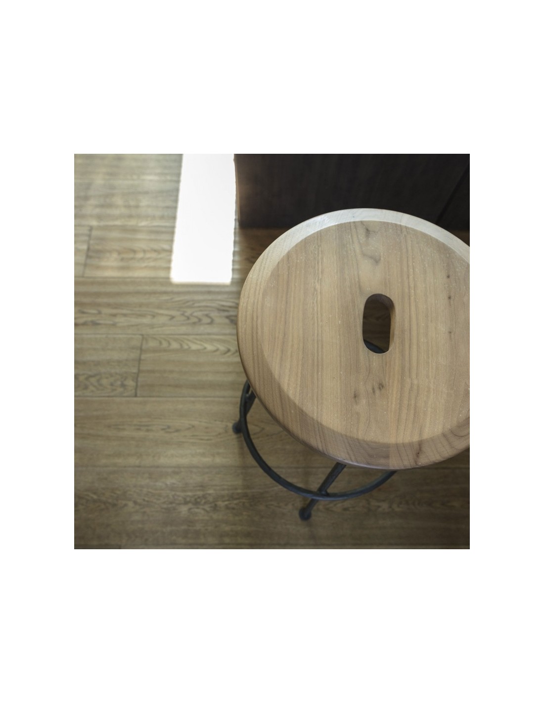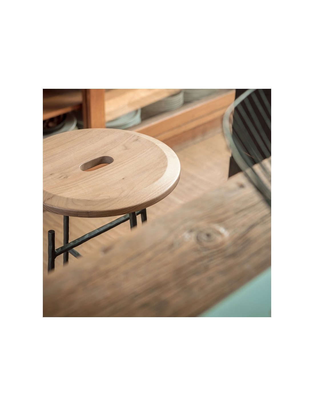Sbagliato è lo sgabello social di Mogg con struttura in ferro battuto e seduta in massello di Noce Canaletto. Il taglio della gamba diventa un gancio per borse e abiti permettendoci di avere le mani libere e dedicarci a quello che stiamo facendo in completa libertà e di dialogare con i gesti, qualsiasi essi siano.