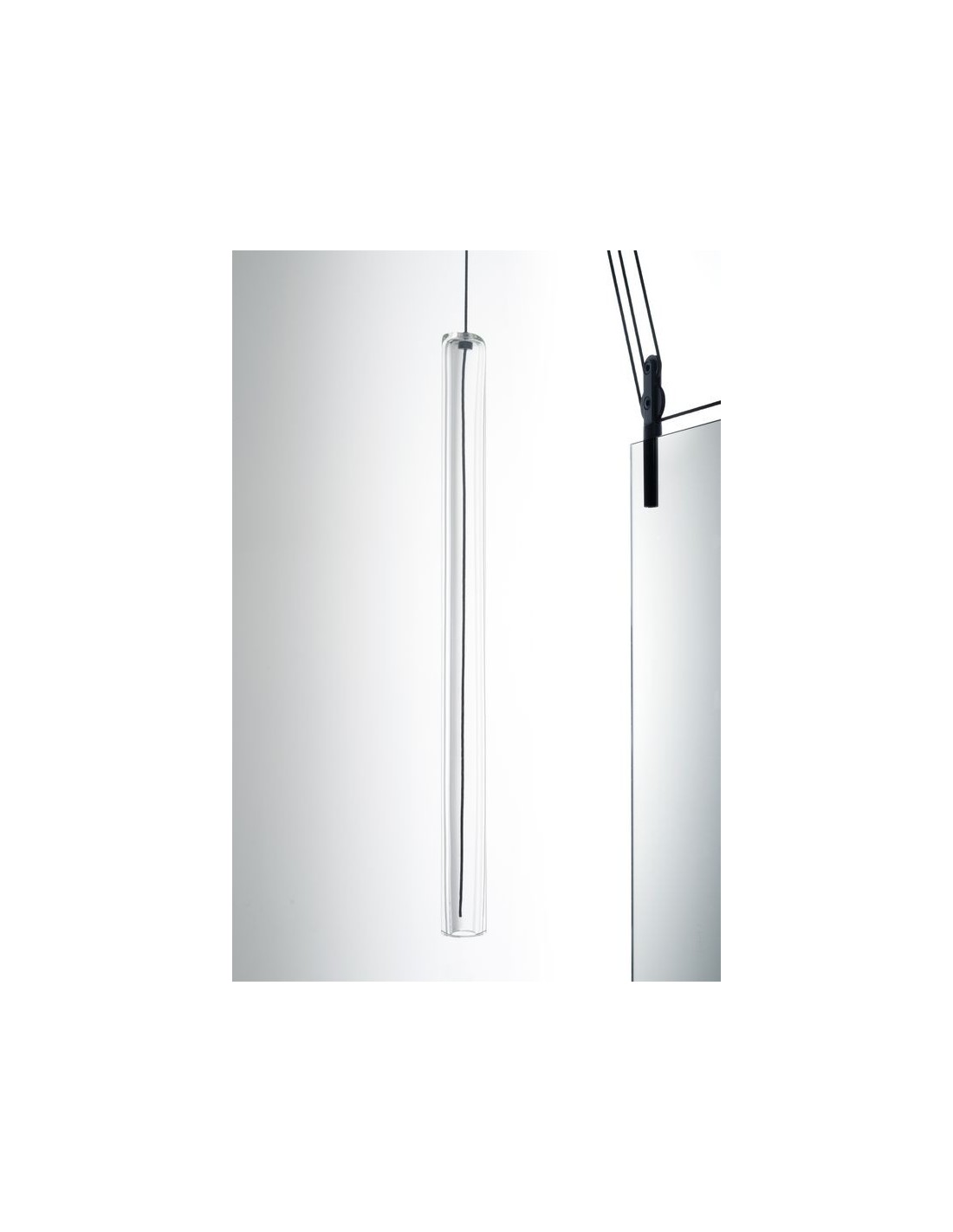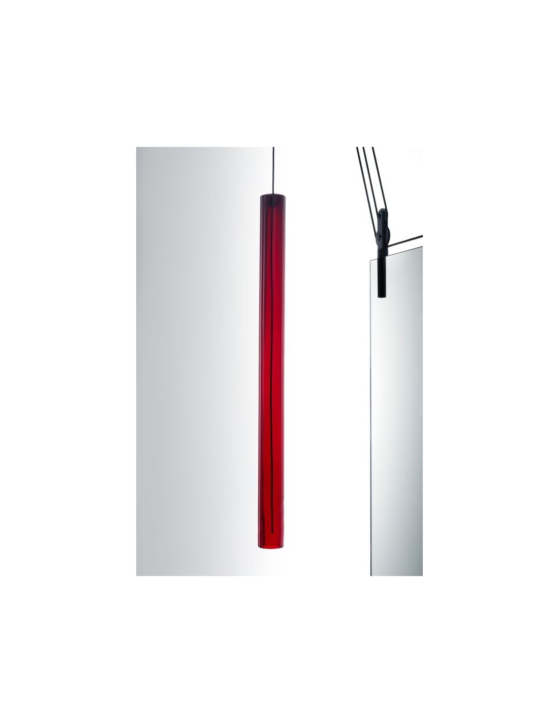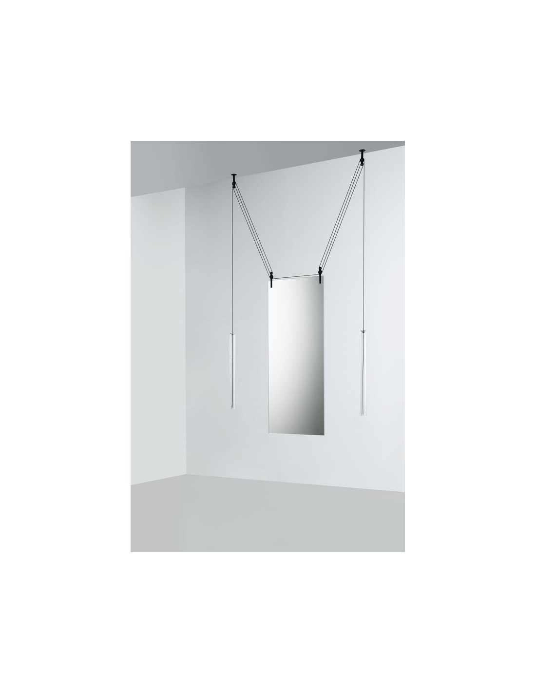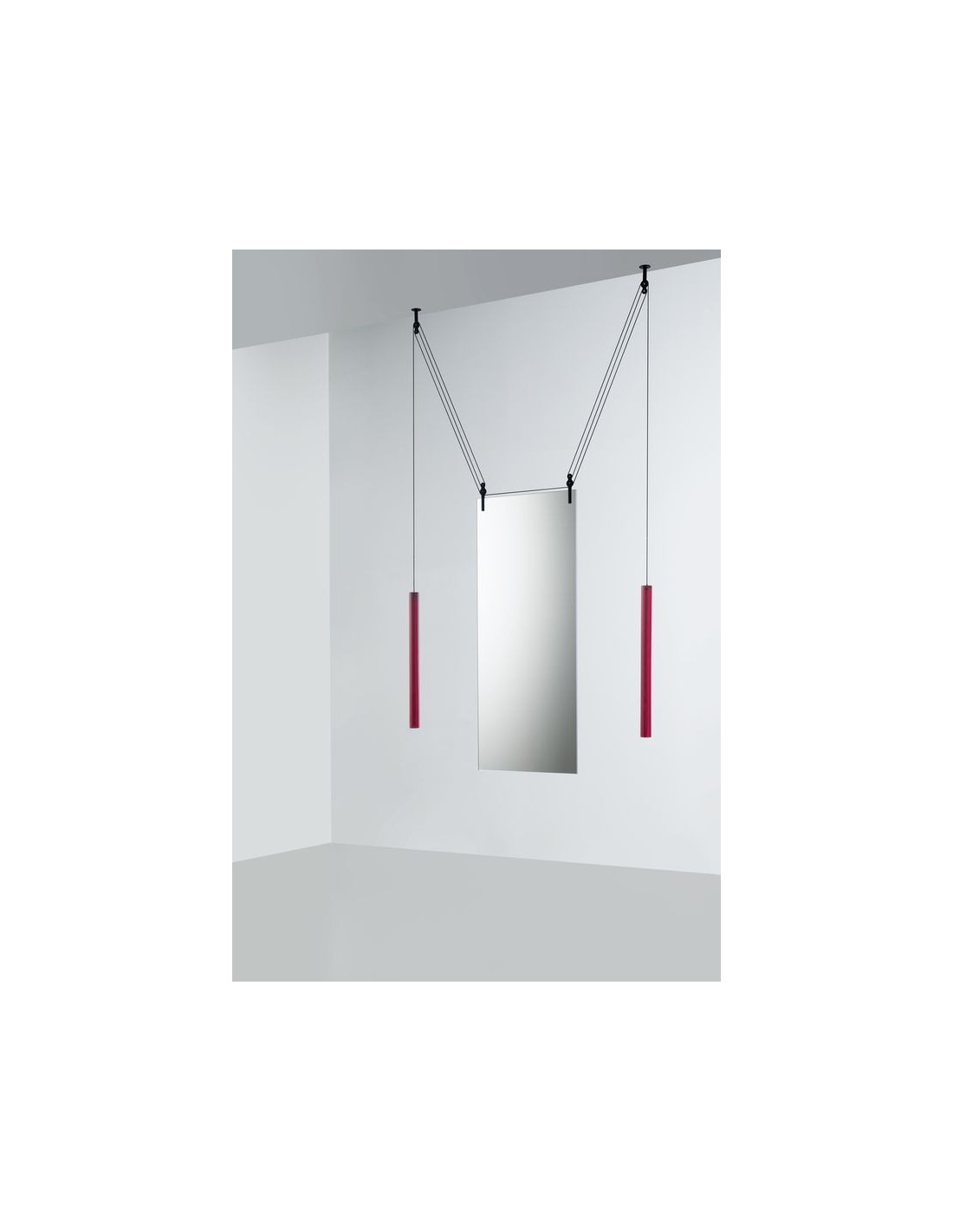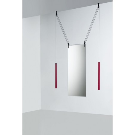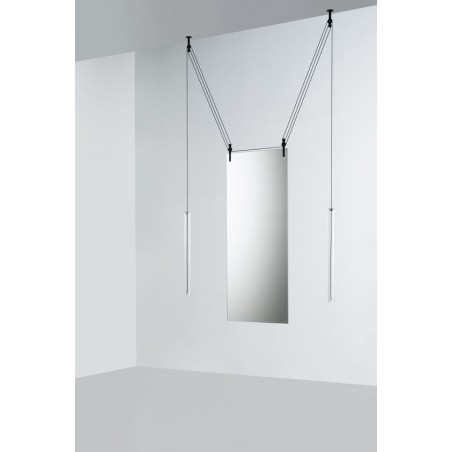 Lo studio Ronan & Erwan Boroullec disegna per Glas questo specchio bifacciale d'eccezione, Palanco.Lo specchi grazie ad un sistema di carrucole può essere spostato dalla sua posizione verticale all'orizzontale e viceversa.Adatto ad essere in mostra ad una parete ma grazie alla caratteristica bifacciale anche al centro di una stanza.I contrappesi sono in vetro soffiato e di colore cristallo rosso e marrone, mentre le carrucole in alluminio nero.