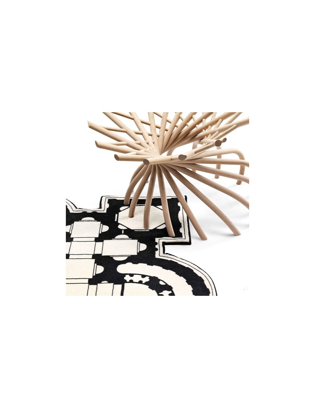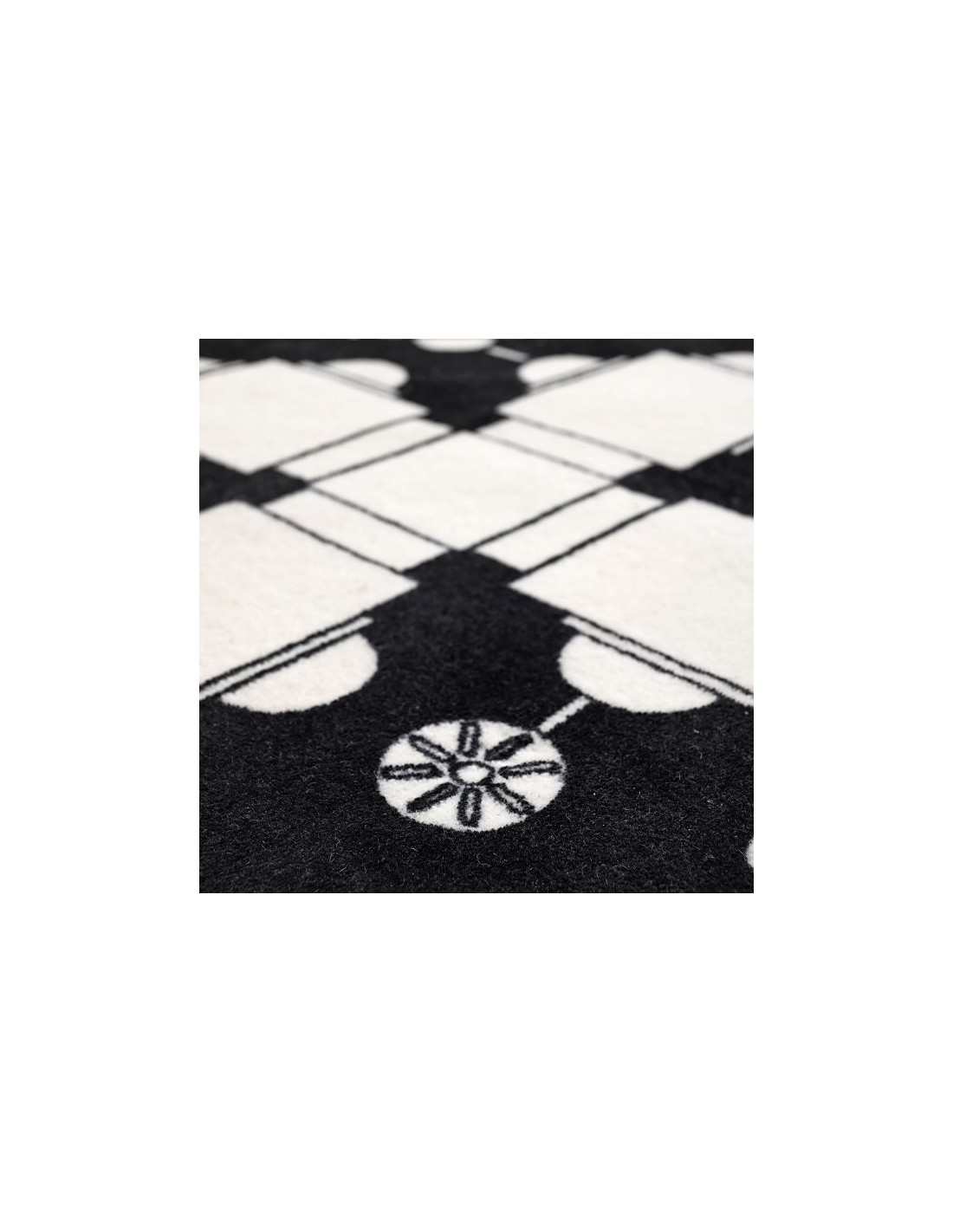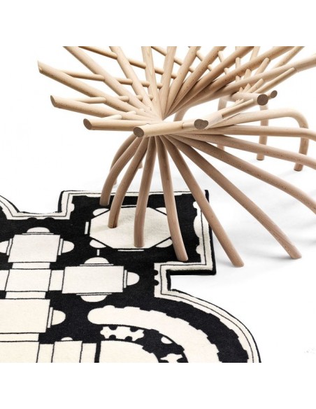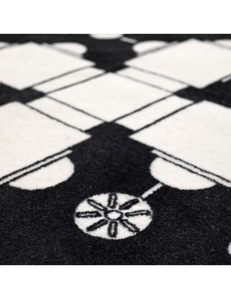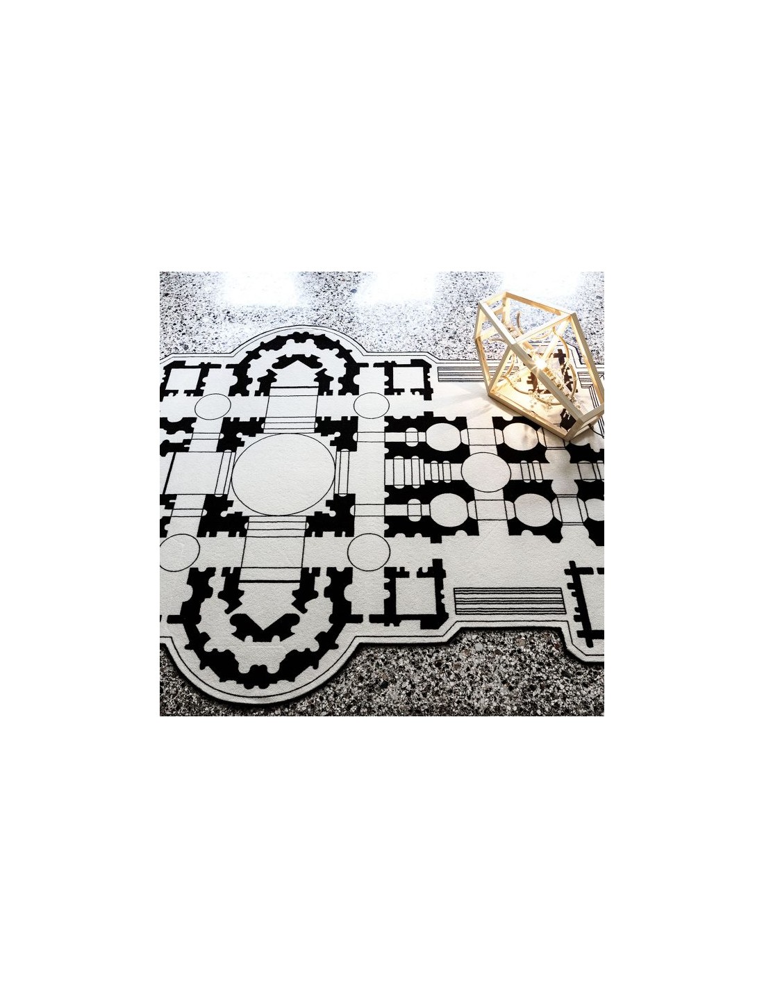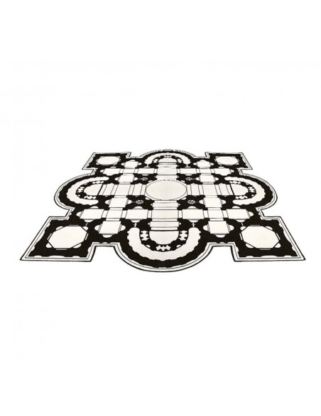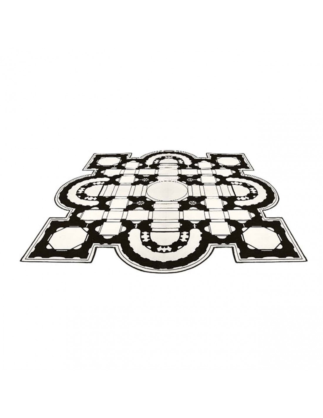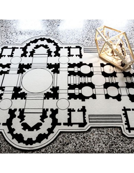 Pietro è un tappeto che prende ispirazione dalla planimetria della famosa Basilica di San Pietro, una chiesa tardo-rinascimentale situata all'interno della Città del Vaticano. È realizzato in 80% lana e 20% poliammide stampato in bianco e nero con bordo a filo ed è disponibile in due misure.