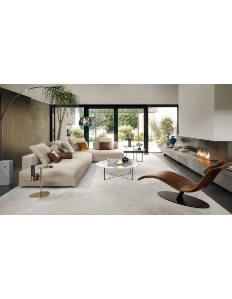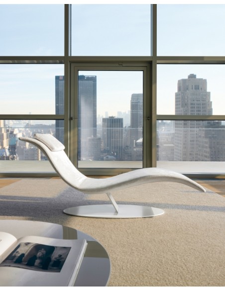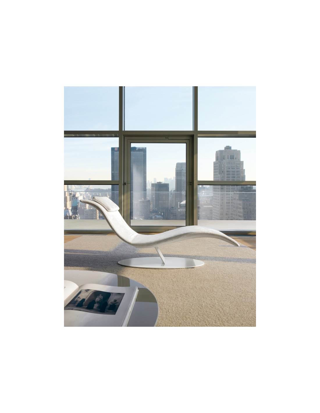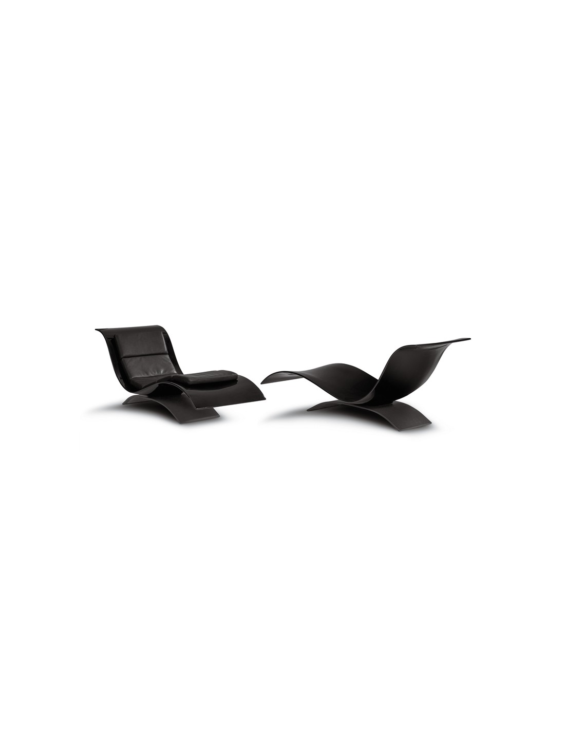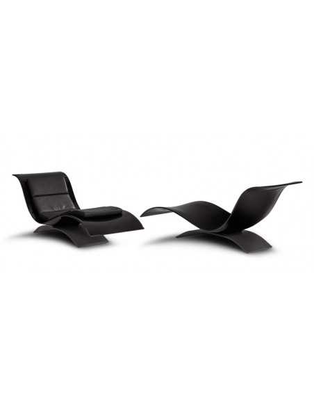 Poltrona chaise longue con struttura in poliuretano ad alta densità, seduta morbida, base in metallo opaco e design curvilineo elegante.