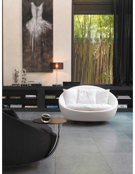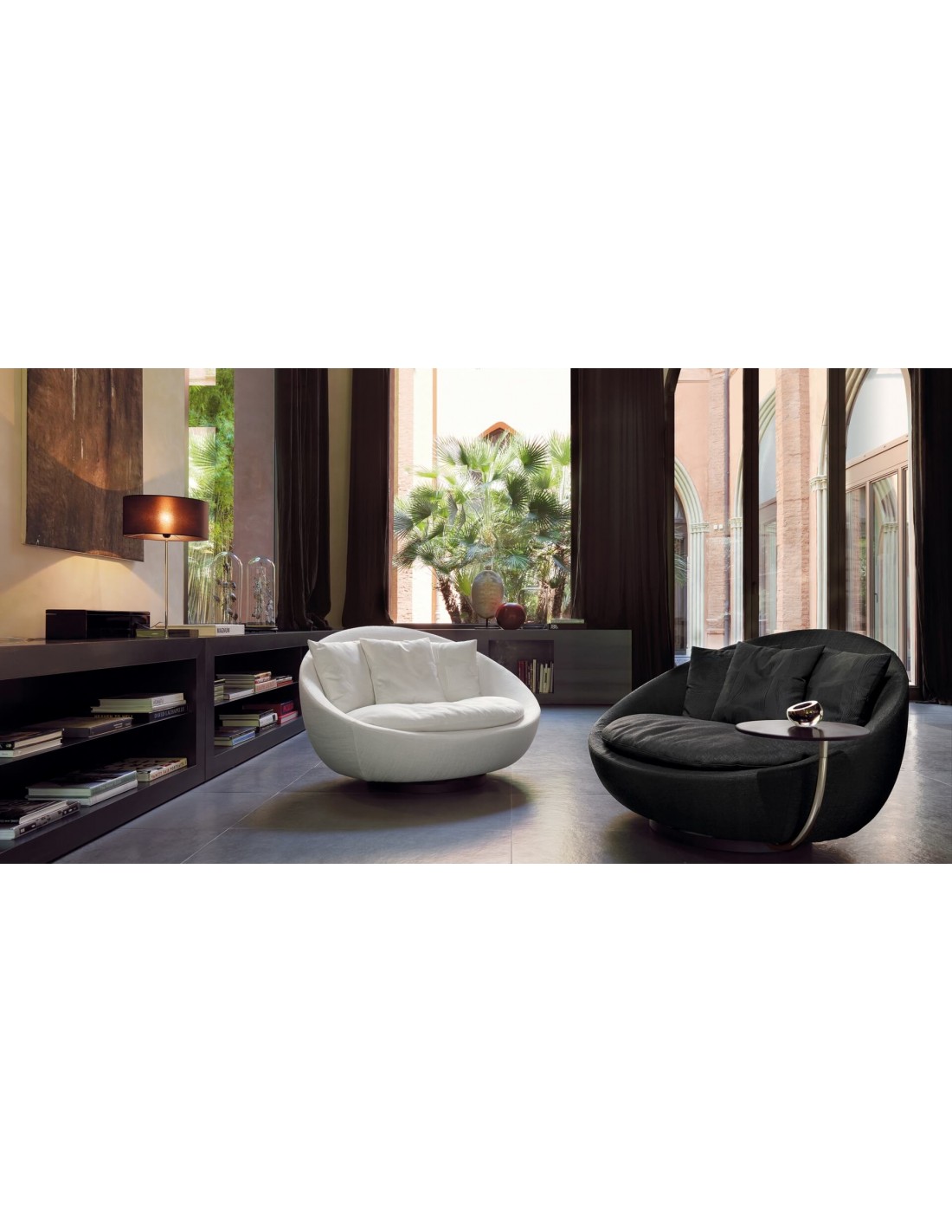Maxipoltrona girevole, dal design avvolgente, con cuscini morbidi e optional tavolino rotante.