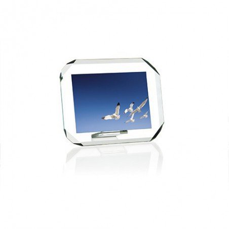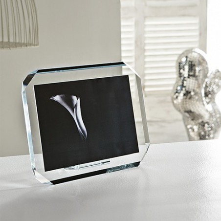 Portaritratto in cristallo extrachiaro con bordi molati inclinati e angoli smussati. 3 dimensioni disponibili in orizzontale e verticale.