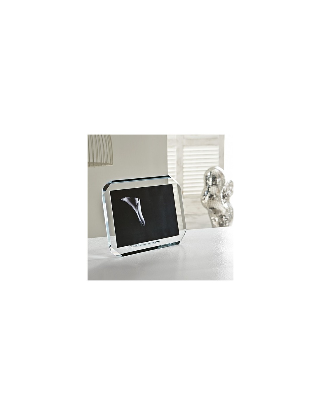 Portaritratto in cristallo extrachiaro 12 mm, quattro lati con bordi molati inclinati 45°, angoli smussati con inclinazione contrapposta.