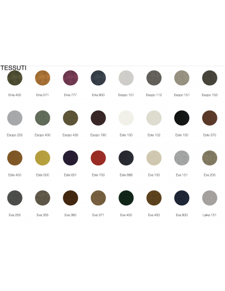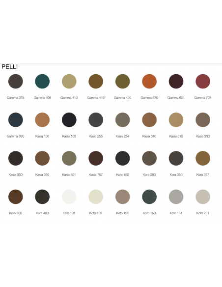 Materiale struttura: Telaio interno in tubolari e profilati d’acciaio; basamento in legno massello; gambe termoplastiche o rivestite in tessuto/pelle