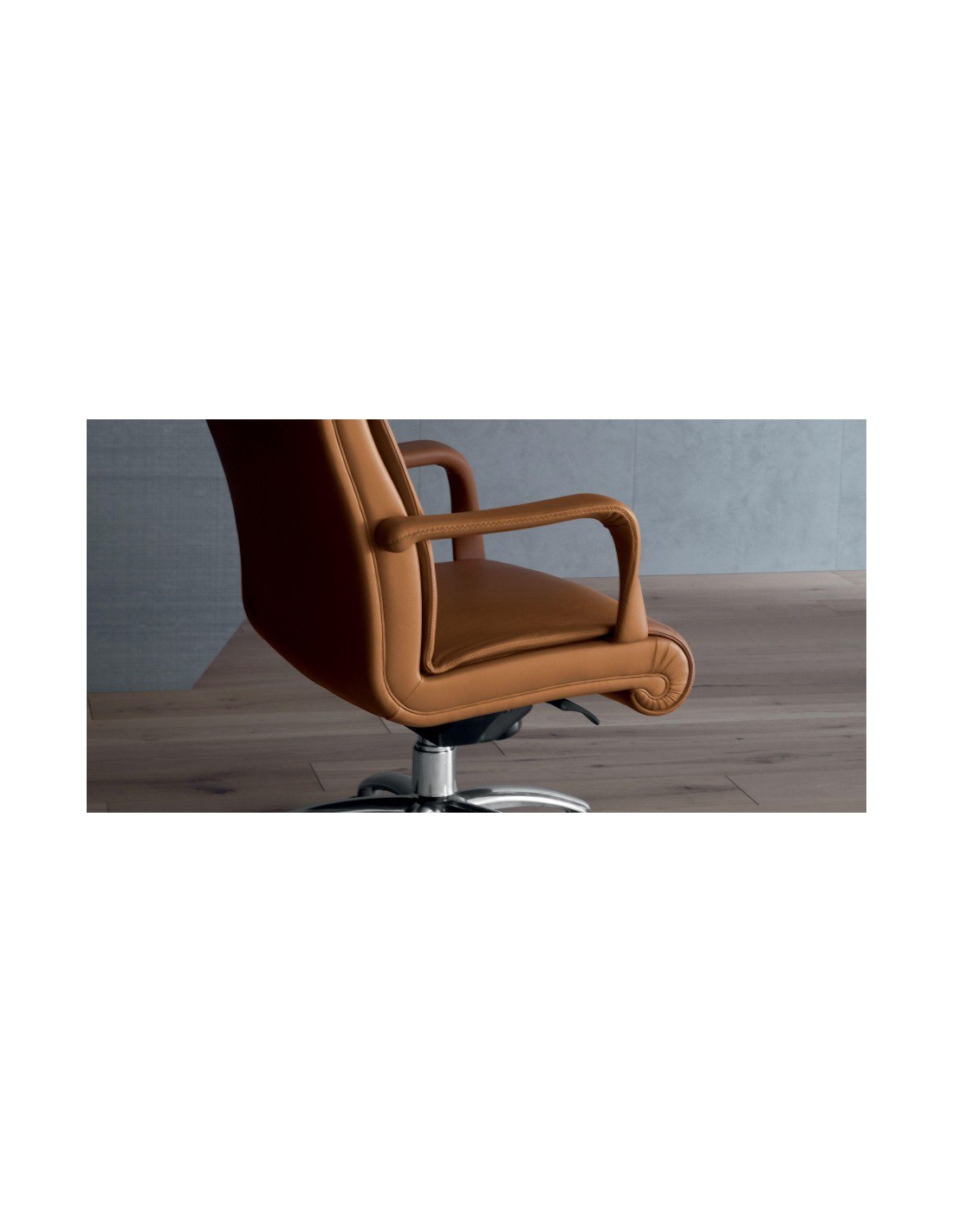 La sedia ufficio Forum Poltrona Frau ha una linea classica e tradizionale impreziosita dal dettaglio a ricciolo su schienale e seduta che conferisce ulteriore eleganza. E' dotata di un basamento a cinque razze in alluminio con ruote auto-frenanti, imbottitura in poliuretano espanso con molle e cinghie elastiche, rivestimento in pelle Frau con lavorazione trapuntata.