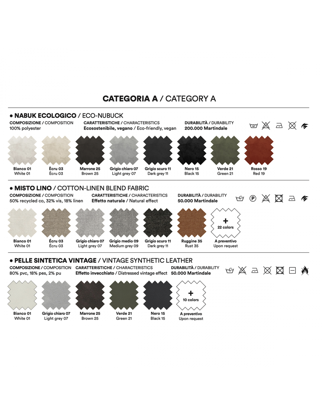 - Rivestimento: versioni imbottite non sfoderabili (varie tipologie di tessuto e pelle, tenere in considerazione schede colori)