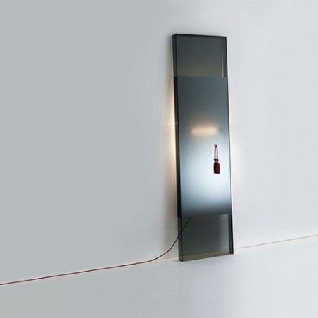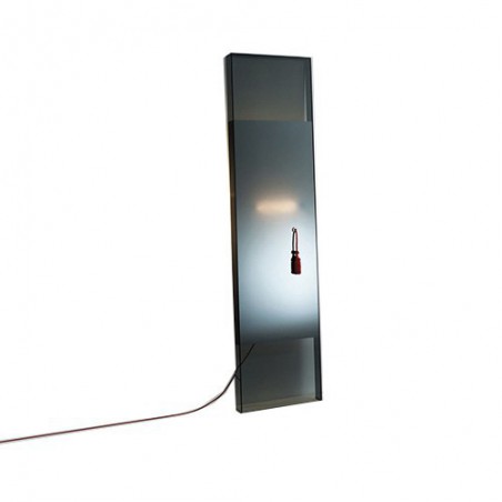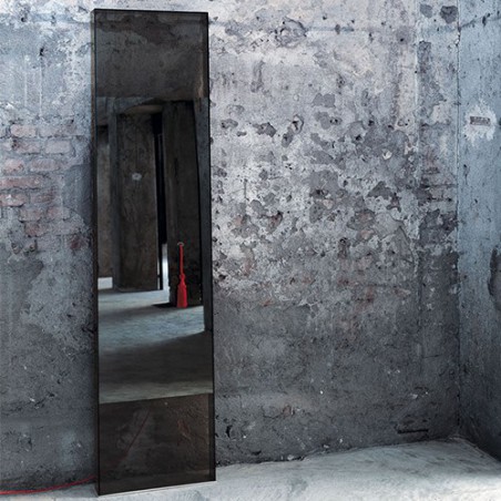 Lo specchio da terra Diva è realizzato in cristallo fumè incollato ed ha la parte superiore ed inferiore trasparente, mentre la parte centrale ha uno specchio attraverso sui si vede la traccia luminosa di una lampada posizionata sul retro.