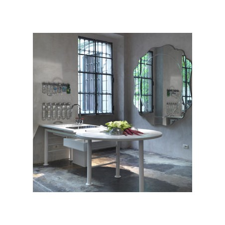Lo specchio Regino disegnato da Paola Navone per Opinion Ciatti ricorda un design passato e reso attuale da questa sagomatura con incisione frontale. Può essere montato sia in verticale che in orizzontale.