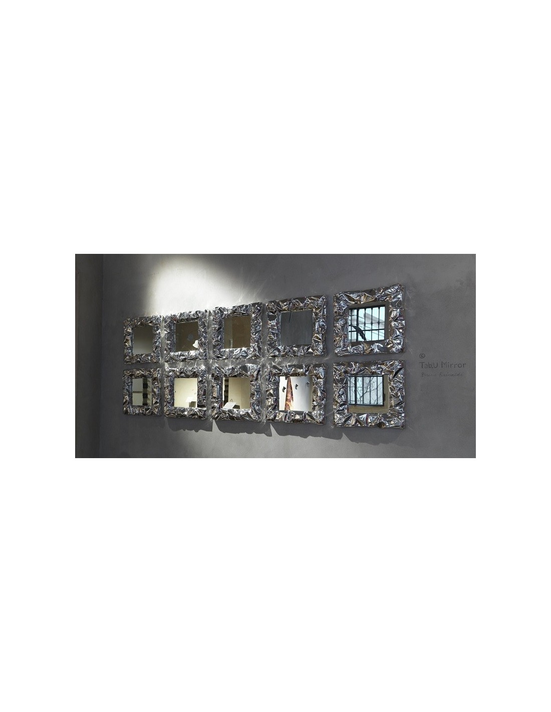 Tab.u mirror fa parte della collezione tab.u. Questo è uno specchio con cornice in alluminio stropicciato a mano. Ogni lavorazione è artigianale e questo rende unico il pezzo. Le finiture sono cromo e oro a specchio