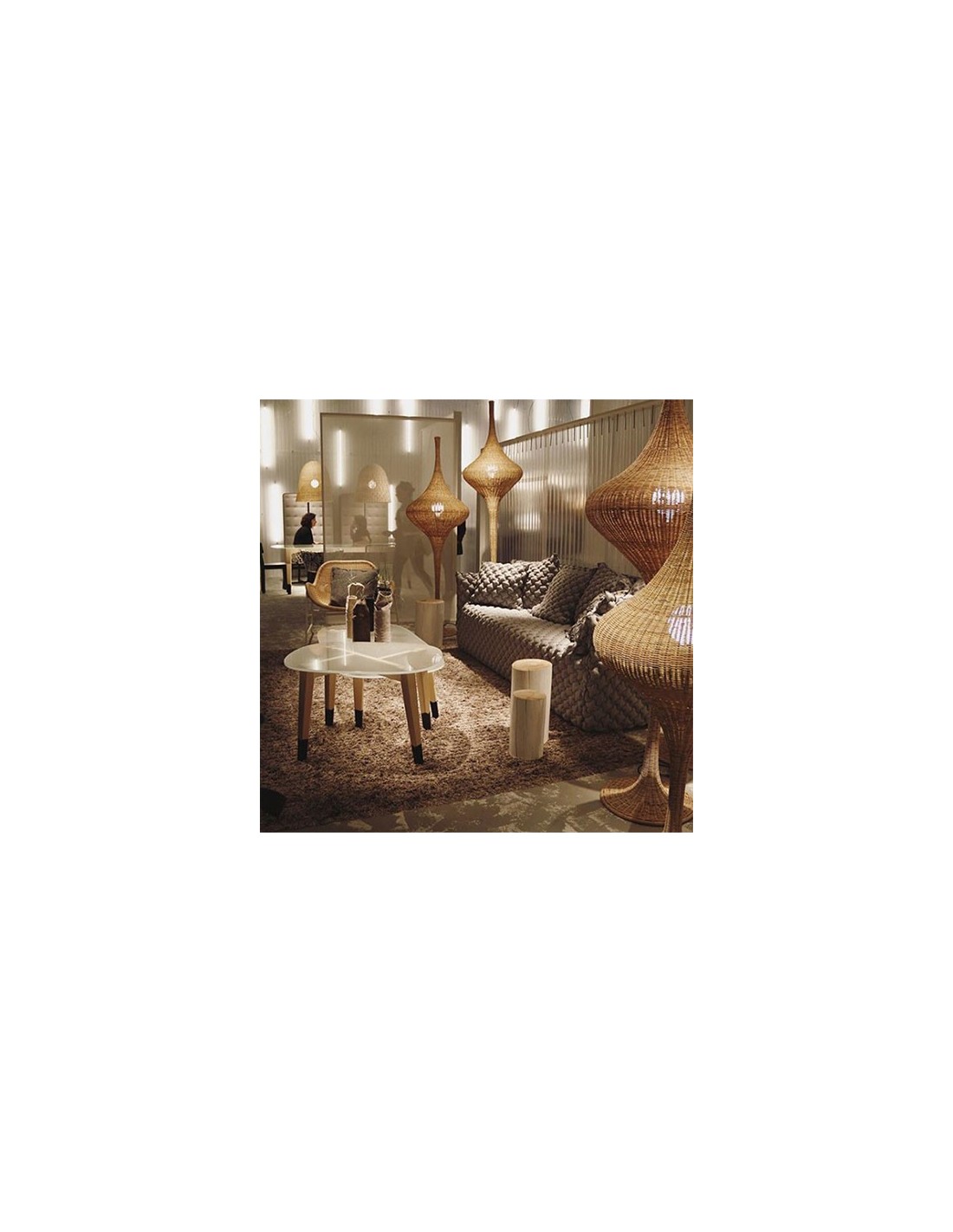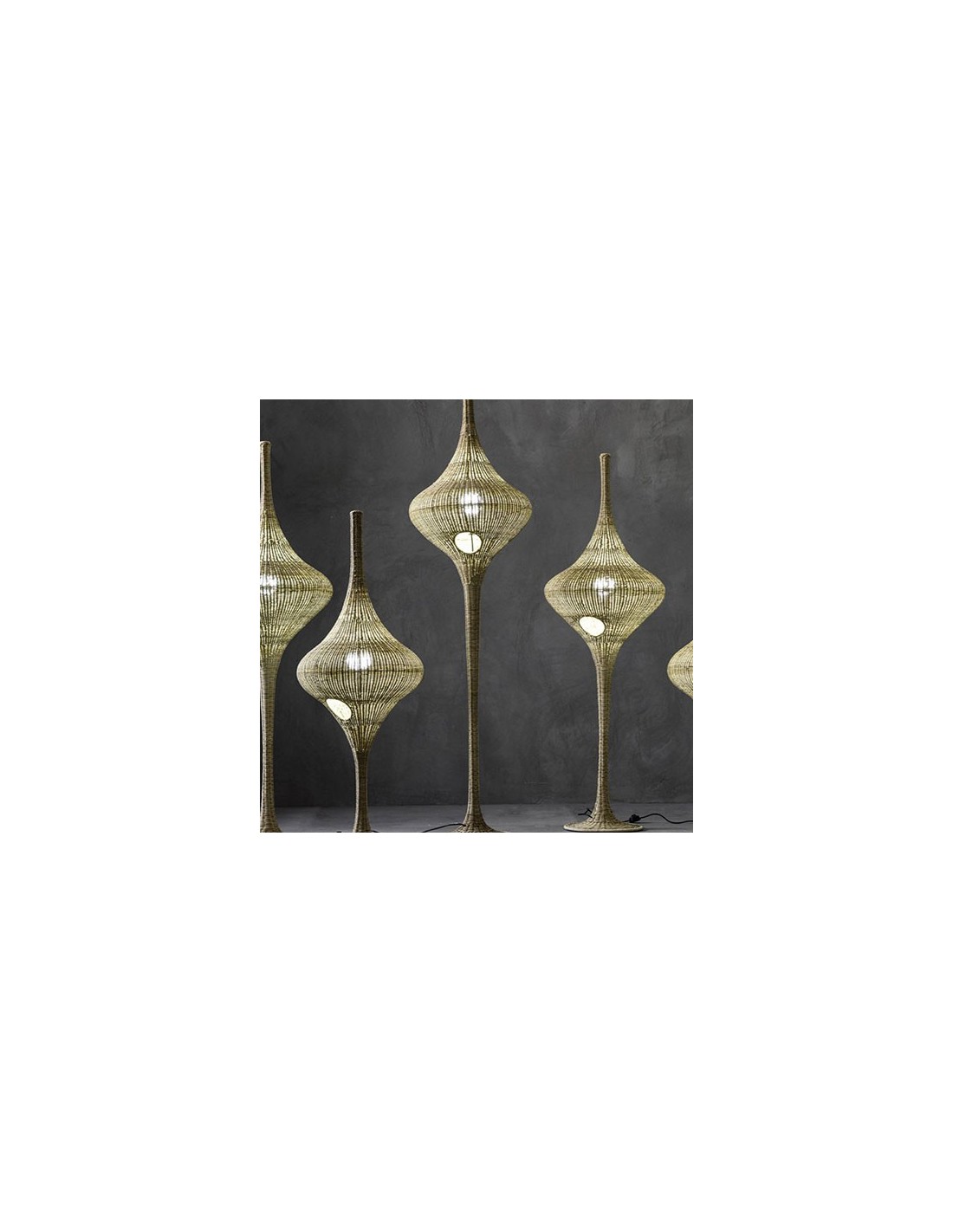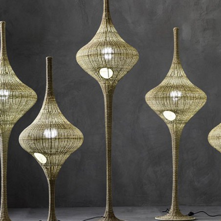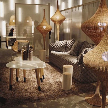 La luce filtra attraverso il midollino, materiale di cui è composta la lampada, creando un’atmosfera calda. Forme sinuose e altezze diverse danno la possibilità di creare configurazioni con più lampade. Completa di cablaggio, interruttore e lampadina.