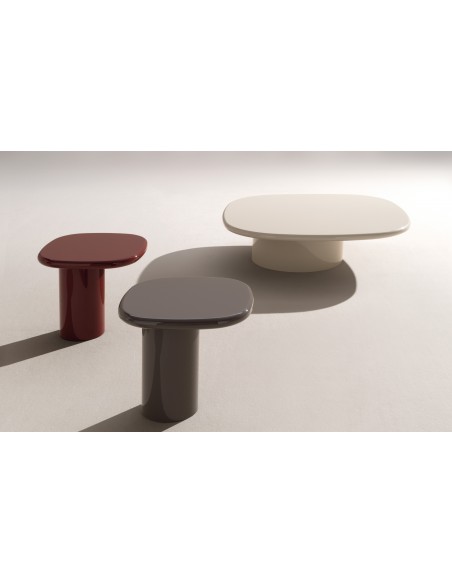 Tavolo dalla forma arrotondata e armoniosa, con dinamici contrasti cromatici che donano leggerezza e fluidità agli ambienti contemporanei.