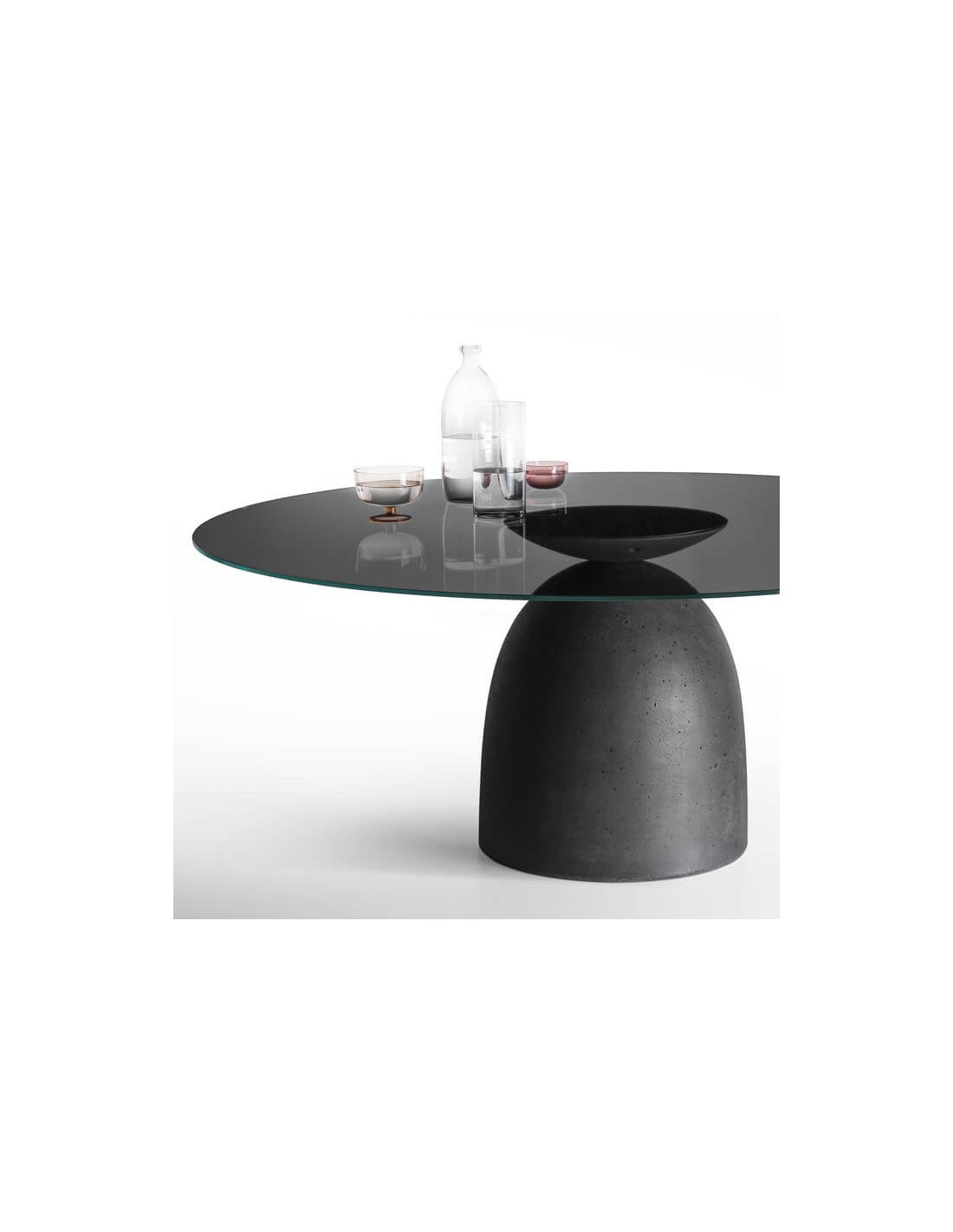 Il tavolo è realizzato in cemento nasconde un elemento strutturale che collega base e top disponibile in vetro o legno.