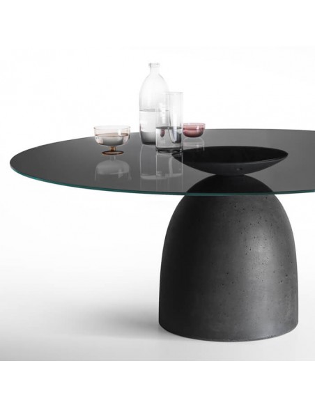 Il tavolo è realizzato in cemento nasconde un elemento strutturale che collega base e top disponibile in vetro o legno.