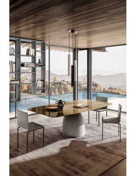 Il tavolo è realizzato in cemento nasconde un elemento strutturale che collega base e top disponibile in vetro o legno.