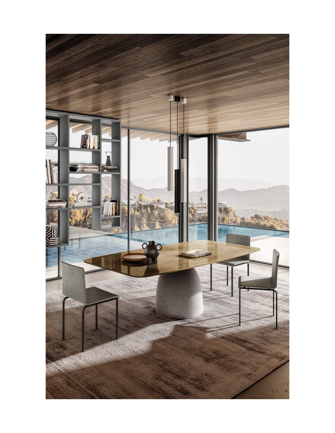 Tecnologia e design, forza e leggerezza i connotati del tavolo Janeiro progettato nel 2019 dallo studio Bartoli , si ispira nel disegno al noto promontorio Brasiliano conosciuto come " Il pan di zucchero " sito a Rio de Janeiro, da cui infatti il tavolo prende il nome .