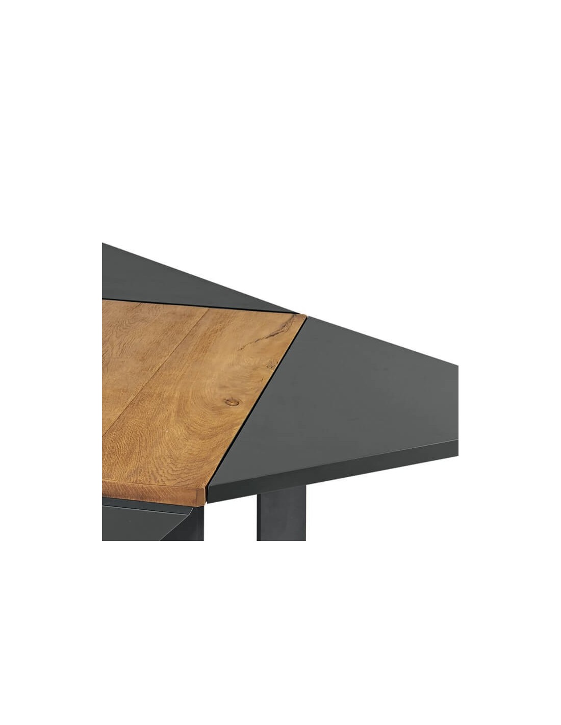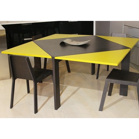Tavolo quadrato allungabile con prolunghe sui quattro lati.