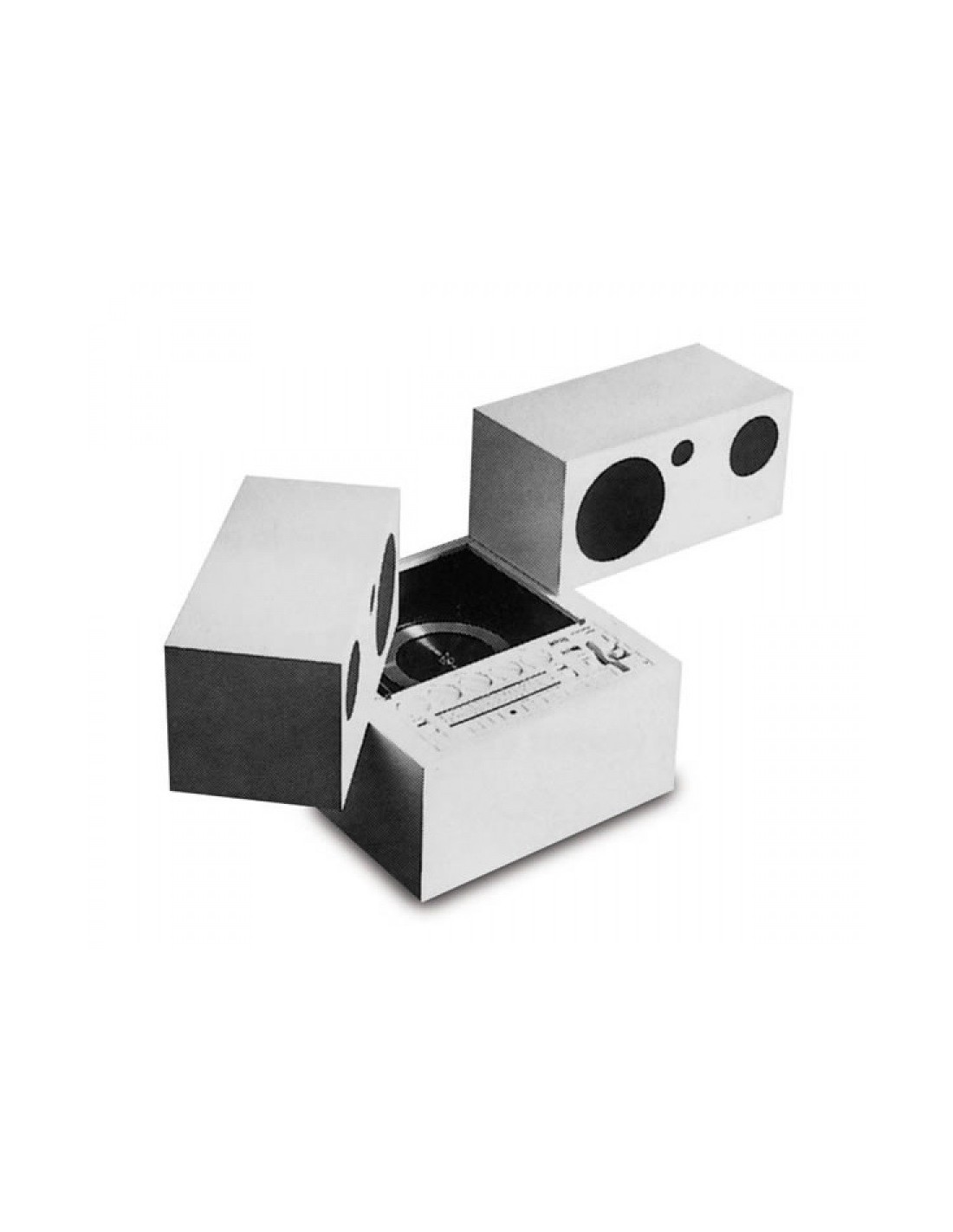 La struttura è realizzata in legno laccato in maniera artigianale, un cubo compatto composto da tre moduli, che nasconde al suo interno un impianto stereo, aprendosi emergono giradischi, pannello di controllo e altoparlanti dotati di sistema girevole e regolabile.