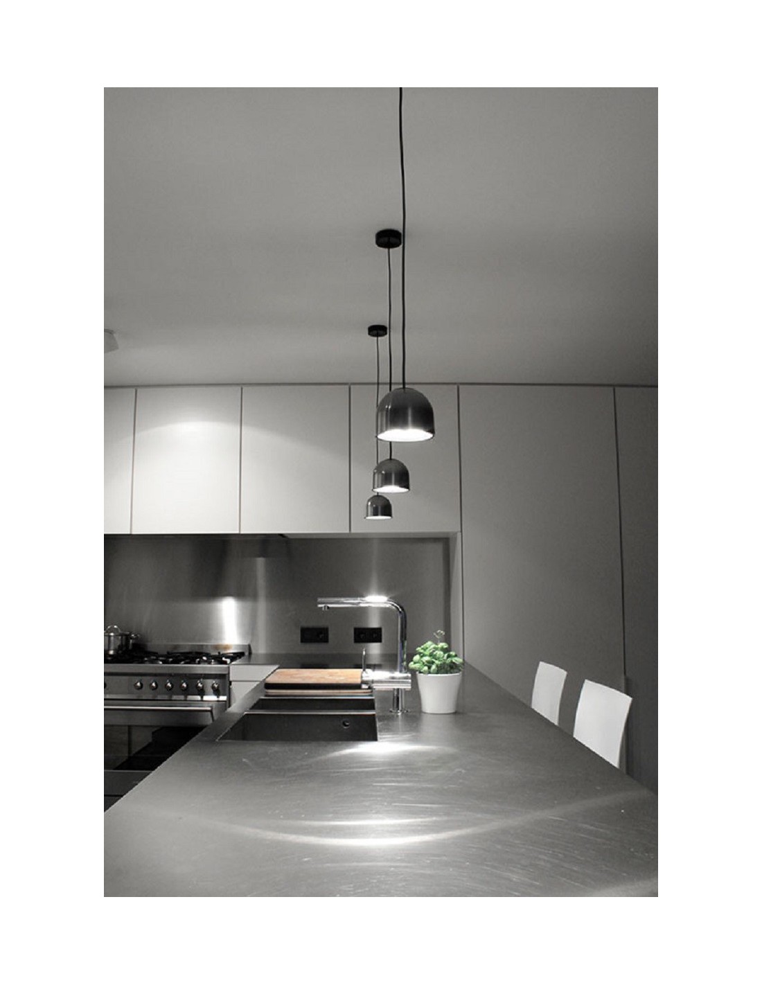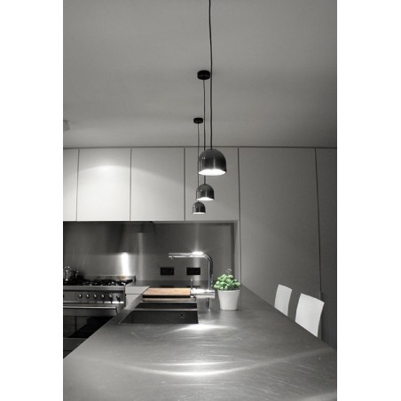 Wan Suspension di Johanna Grawunder, 2006 per Flos è un apparecchio di illuminazione a sospensione a luce diretta. Corpo in alluminio, disponibile nelle finiture bianco lucido e nero lucido. Schermo anti abbagliamento. L'apparecchio è dotato di due differenti anelli con finitura verde e nero, che hanno la funzione di riparare il vetro temperato di sicurezza.
